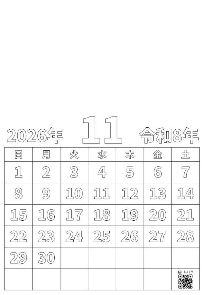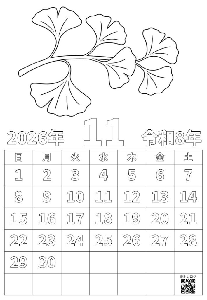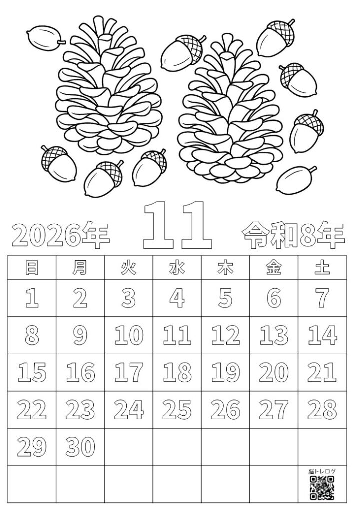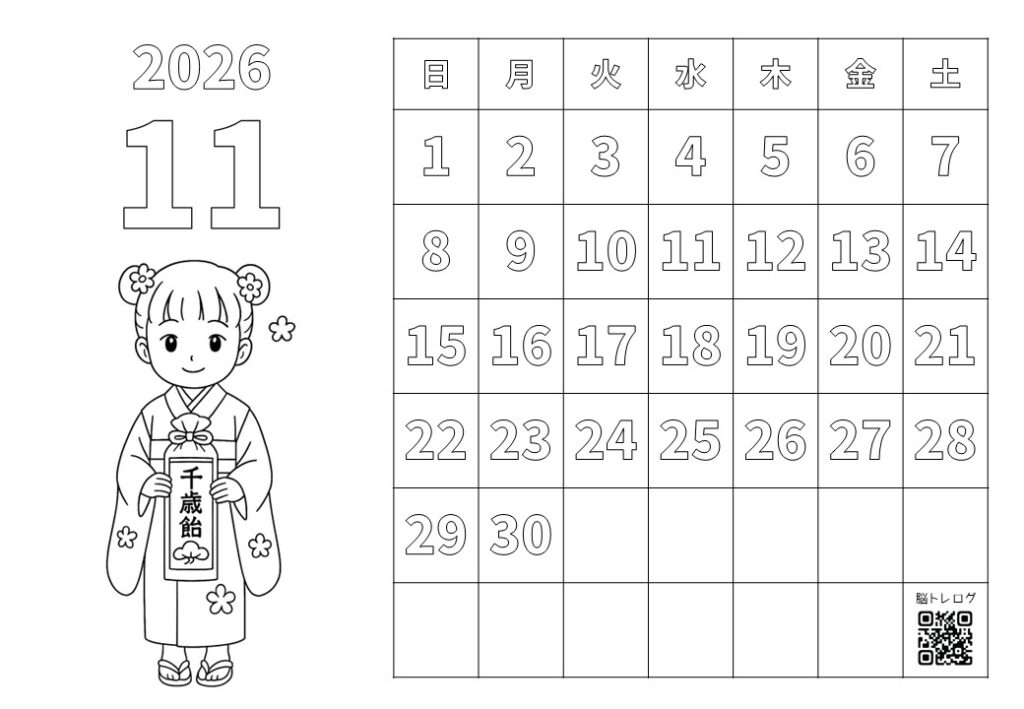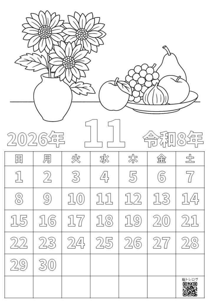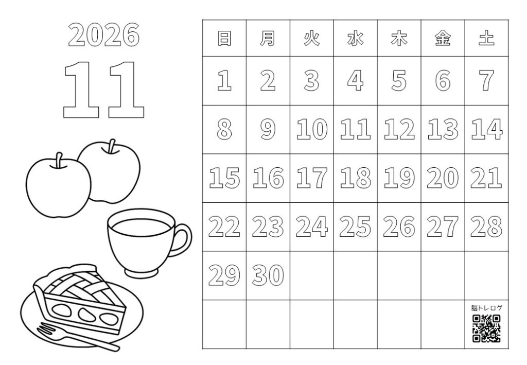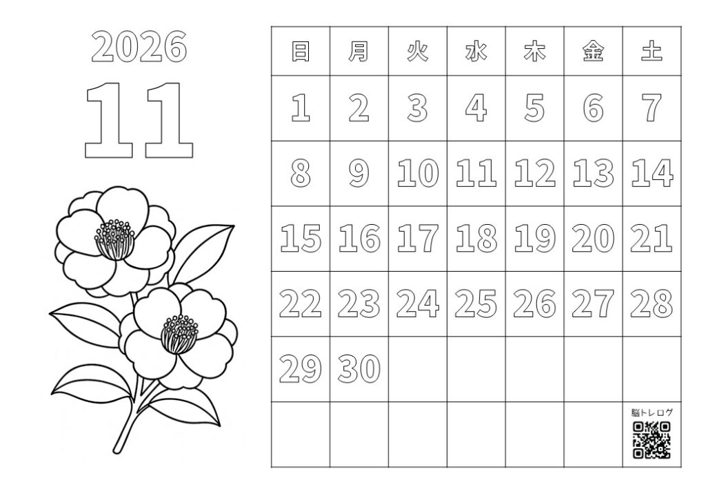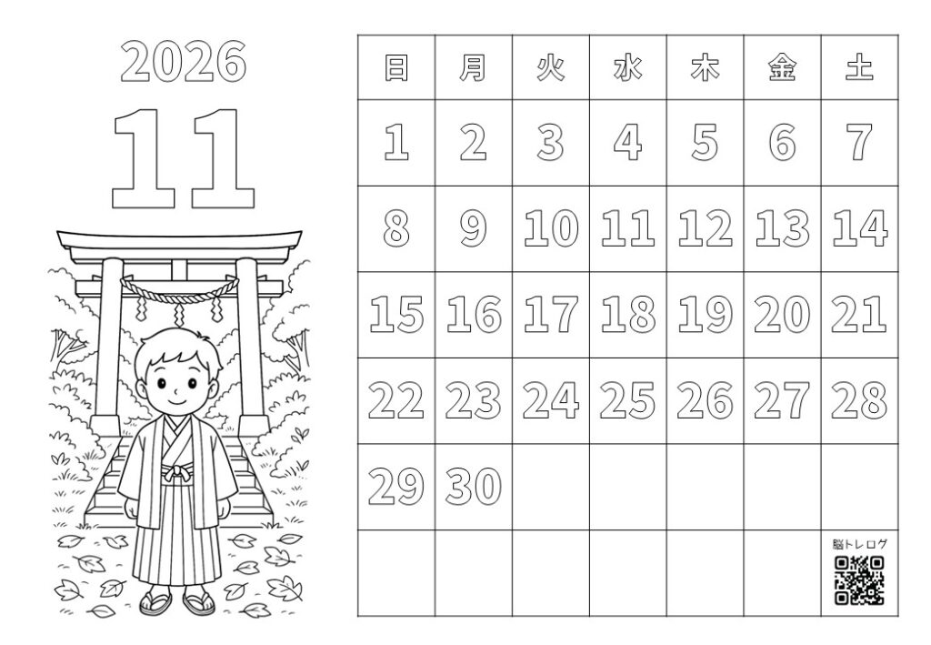 2026年11月のカレンダーと季節のイラストを組み合わせた塗り絵を作りました。