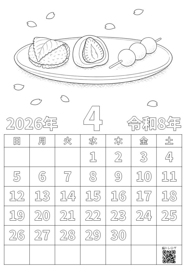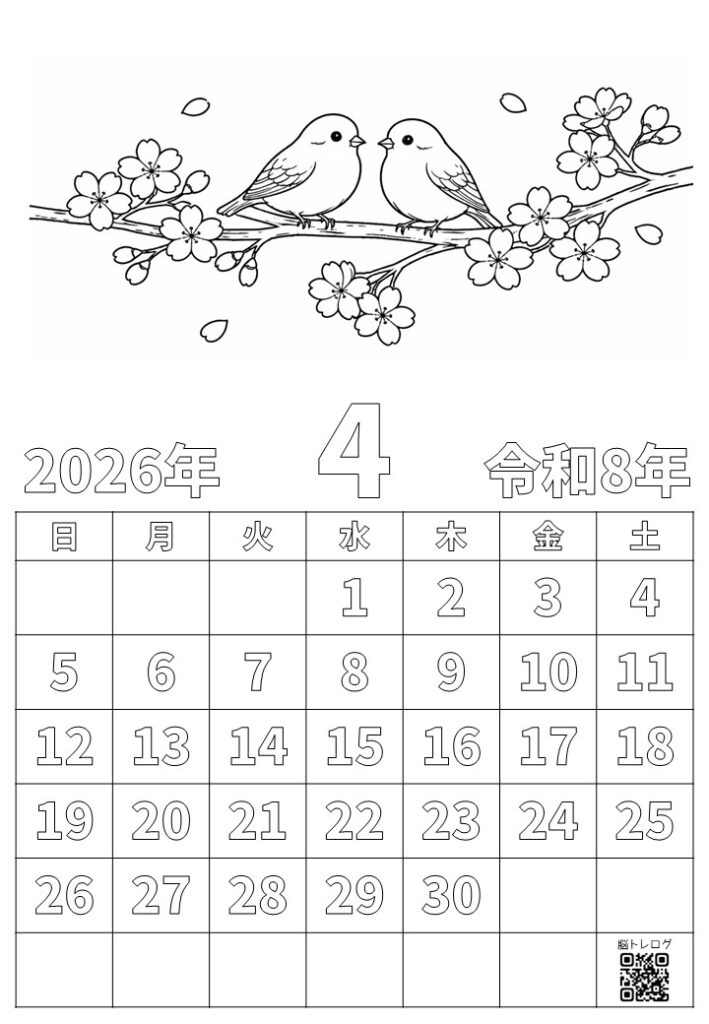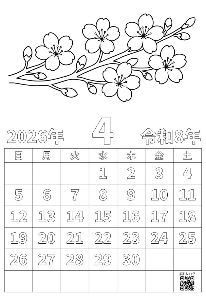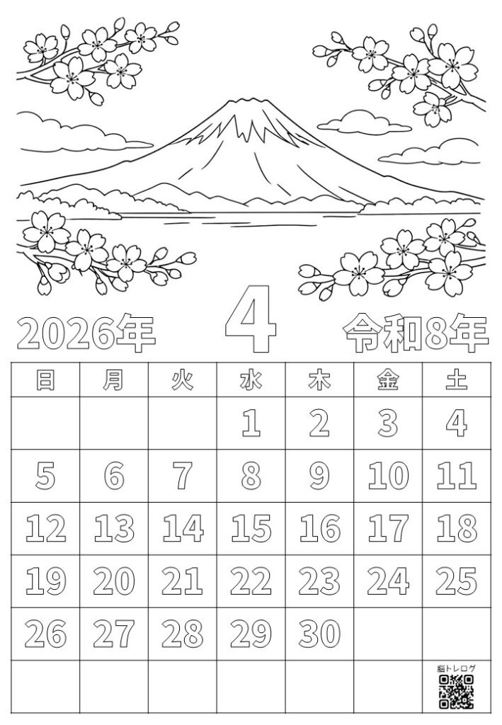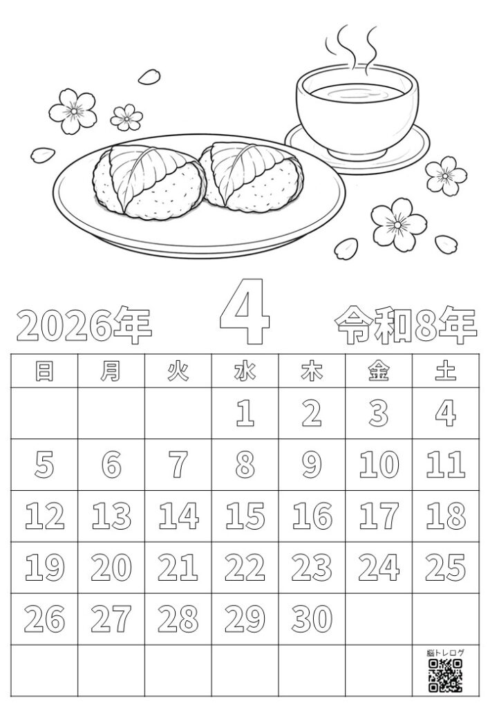 2026年4月のカレンダーと季節のイラストを組み合わせた塗り絵を作りました。無料でダウンロードしていただけますので、デイサービスなどの介護施設やご家庭での認知症予防、リハビリ、レクリエーションなどにご活用ください。