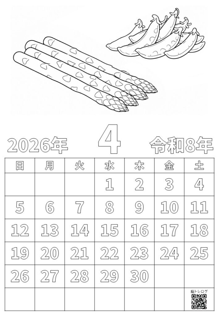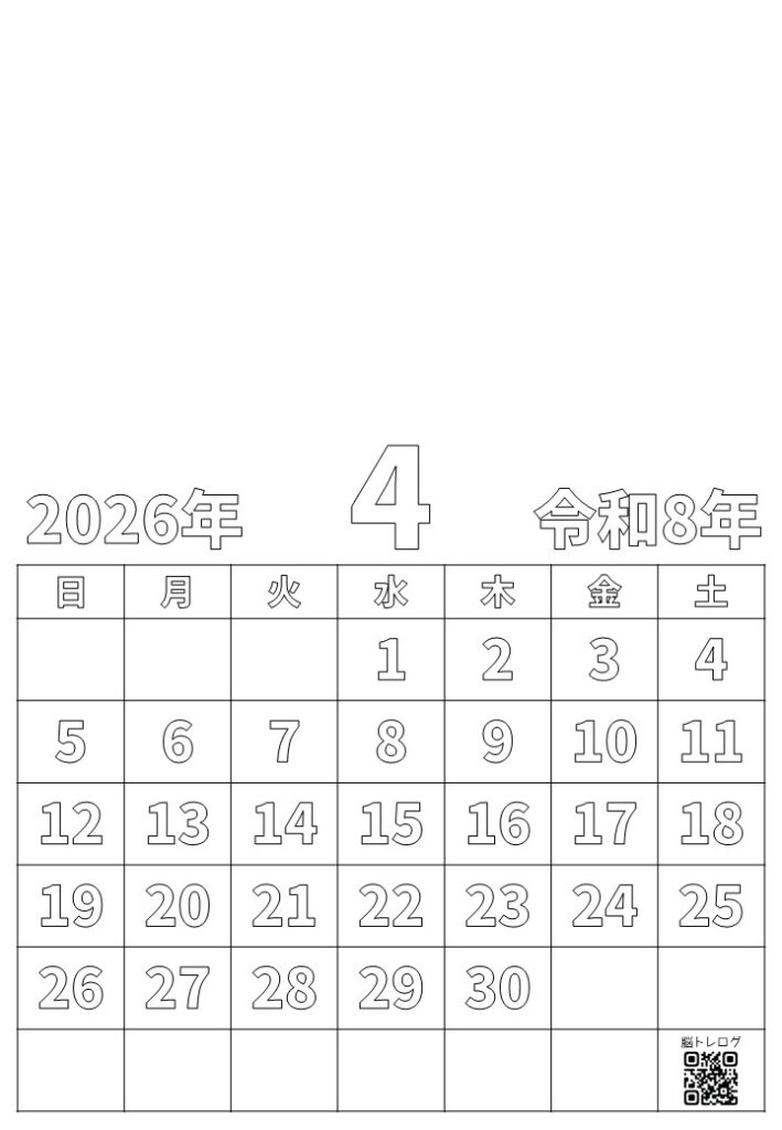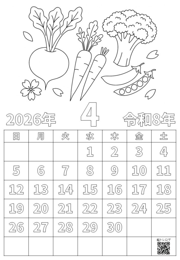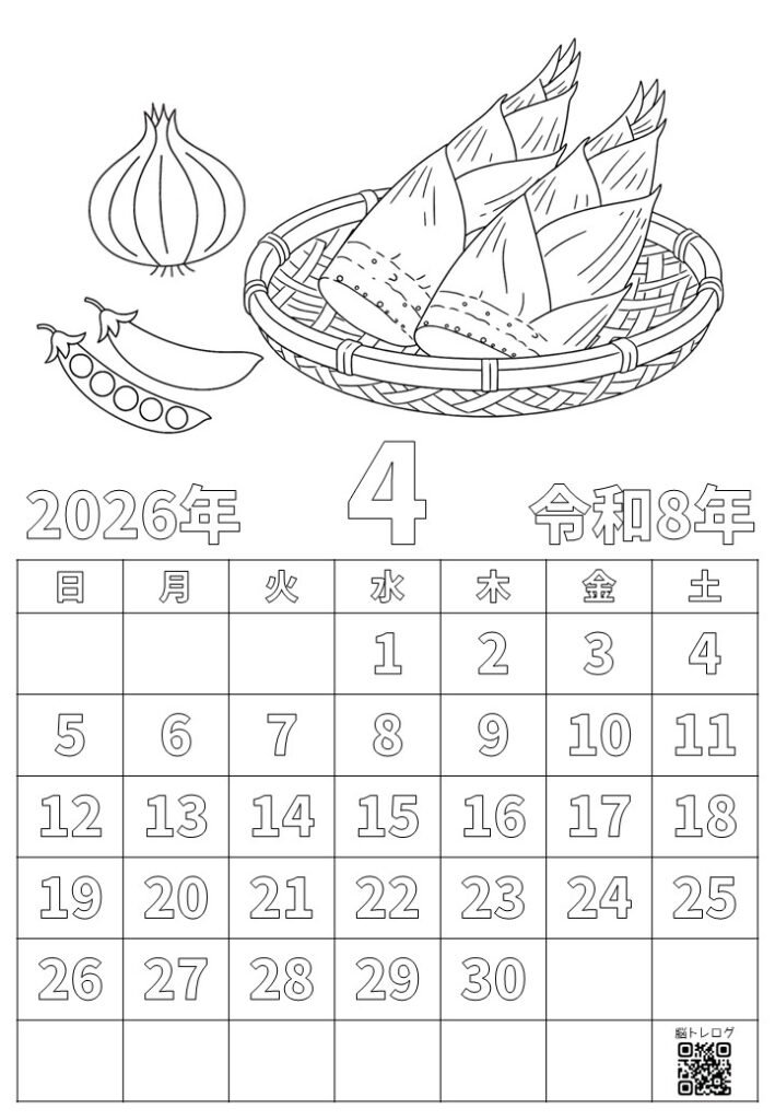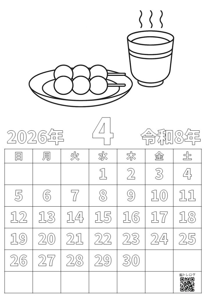 2026年4月のカレンダーと季節のイラストを組み合わせた塗り絵を作りました。無料でダウンロードしていただけますので、デイサービスなどの介護施設やご家庭での認知症予防、リハビリ、レクリエーションなどにご活用ください。