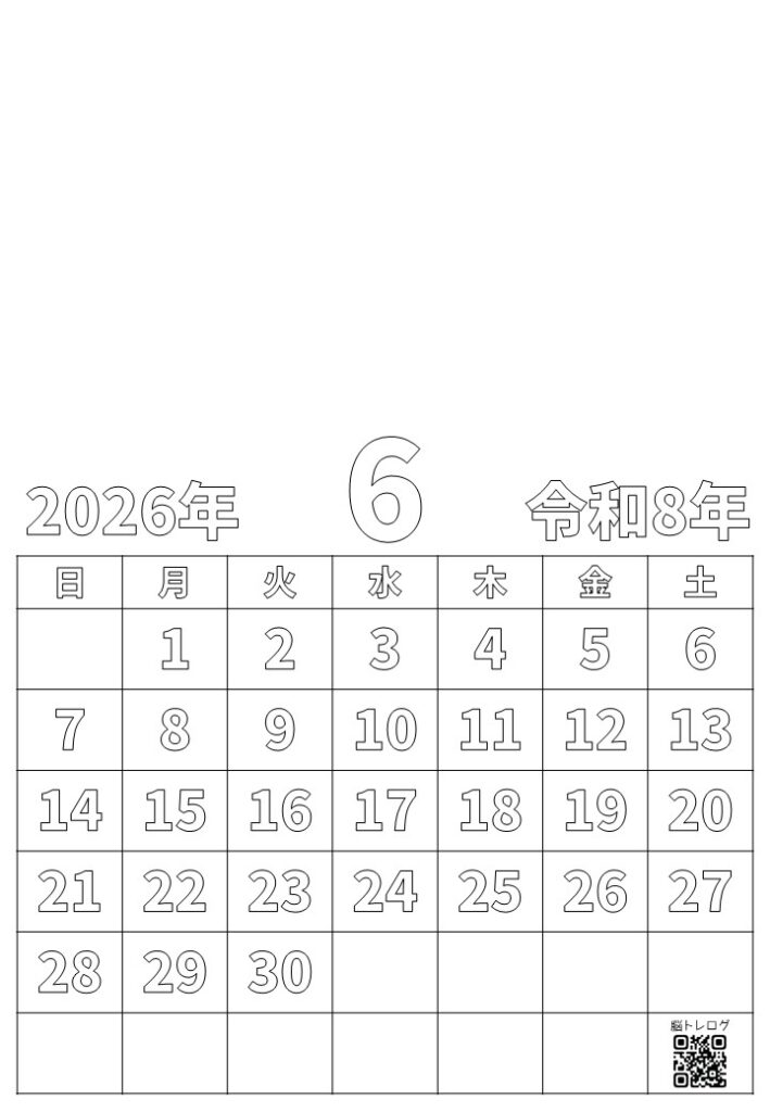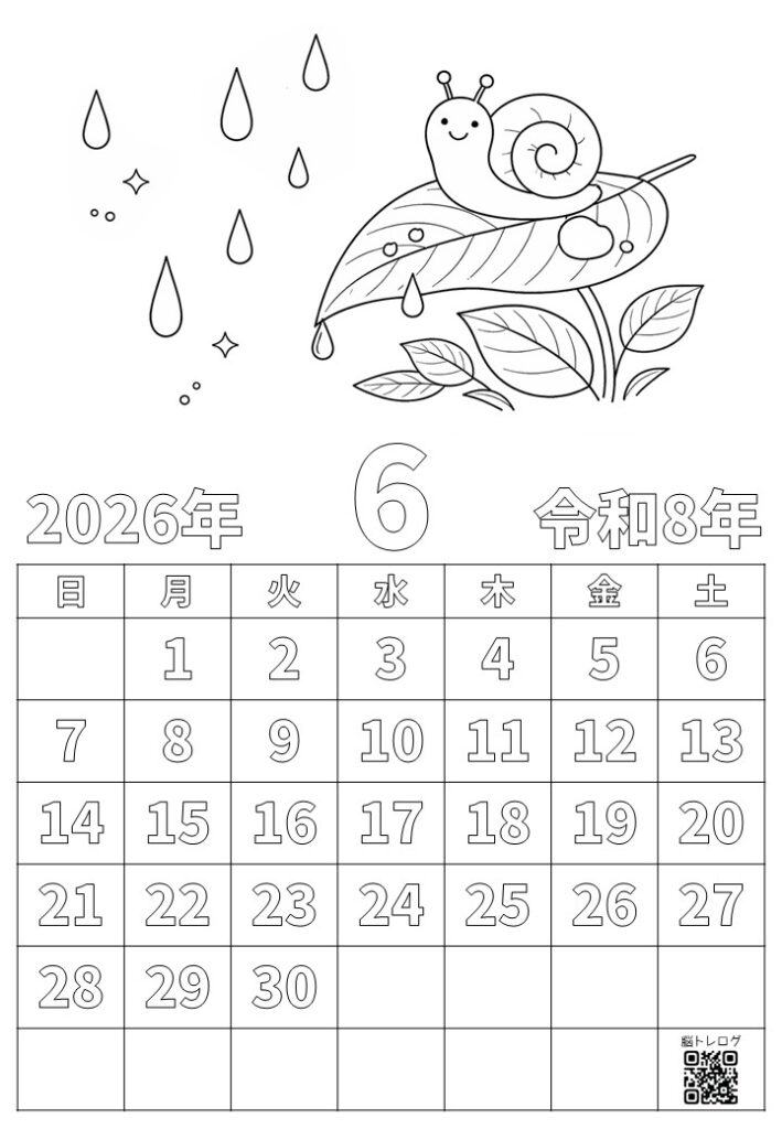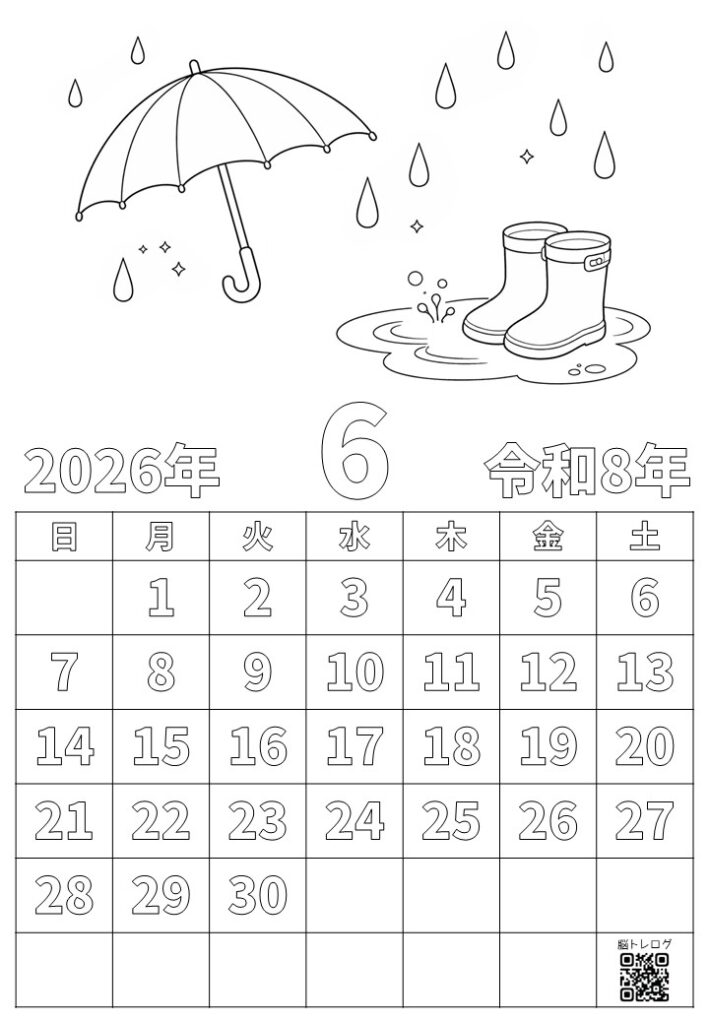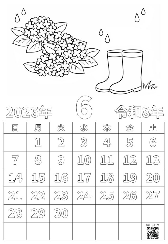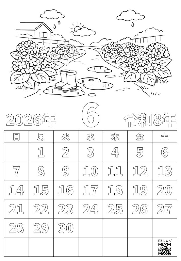 2026年6月のカレンダーと季節のイラストを組み合わせた塗り絵を作りました。無料でダウンロードしていただけますので、デイサービスなどの介護施設やご家庭での認知症予防、リハビリ、レクリエーションなどにご活用ください。