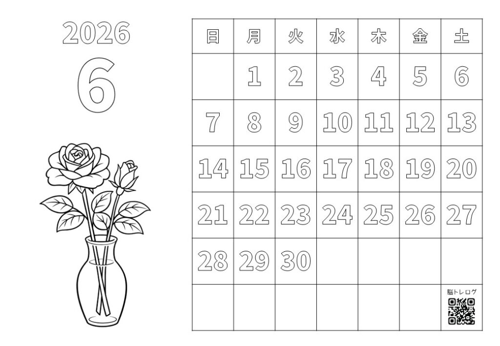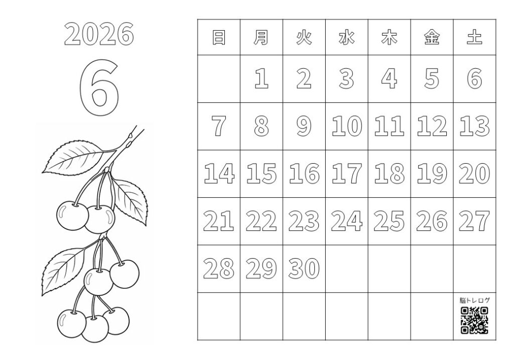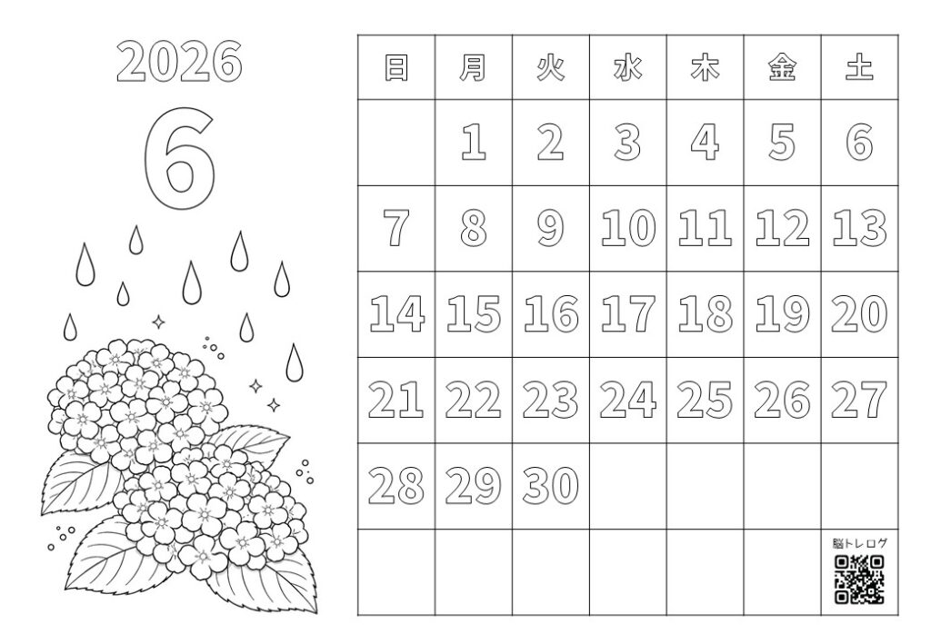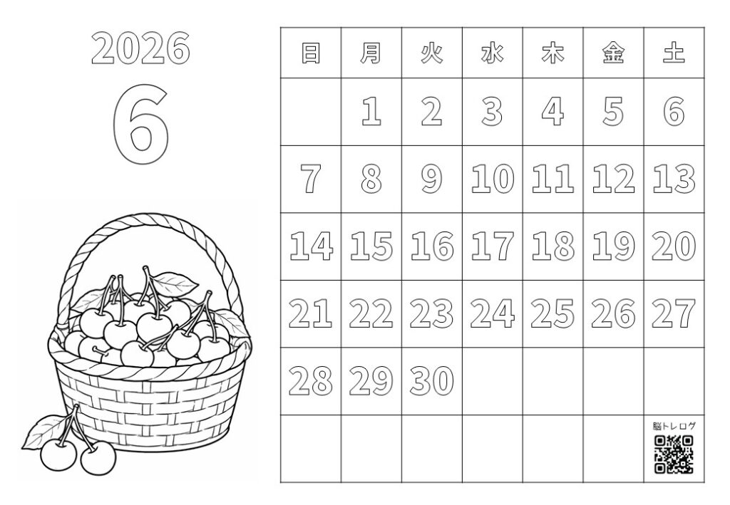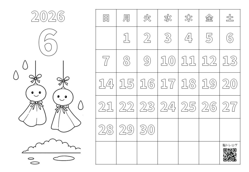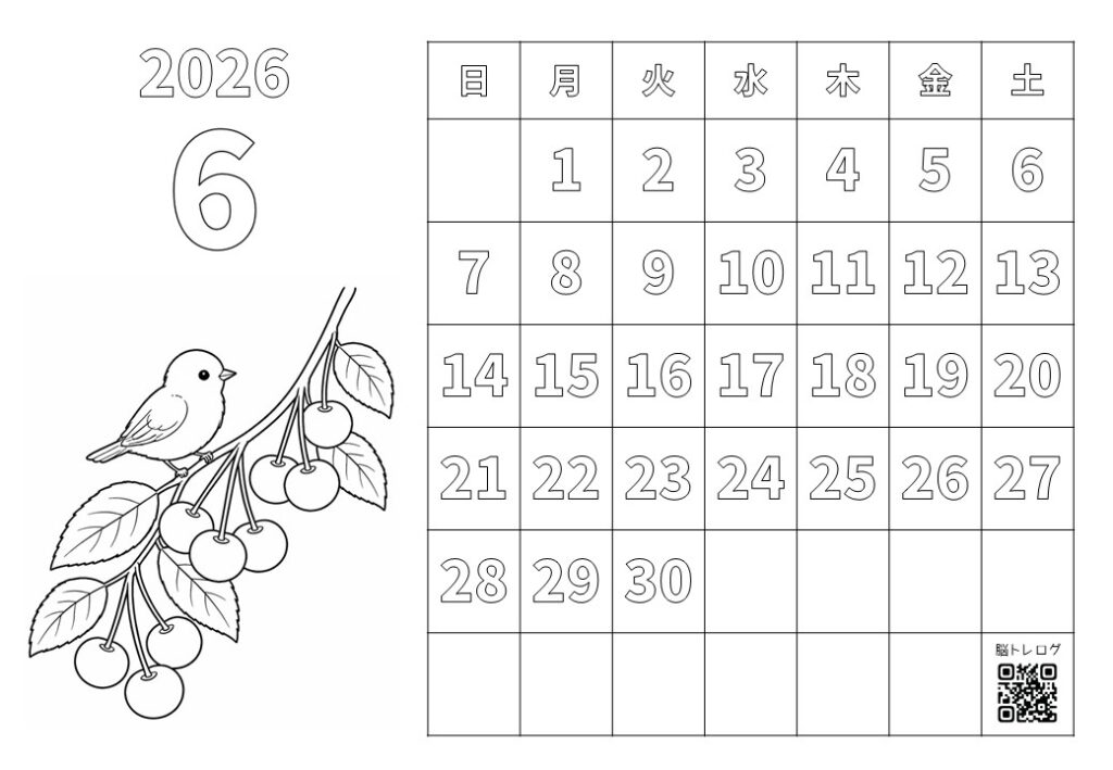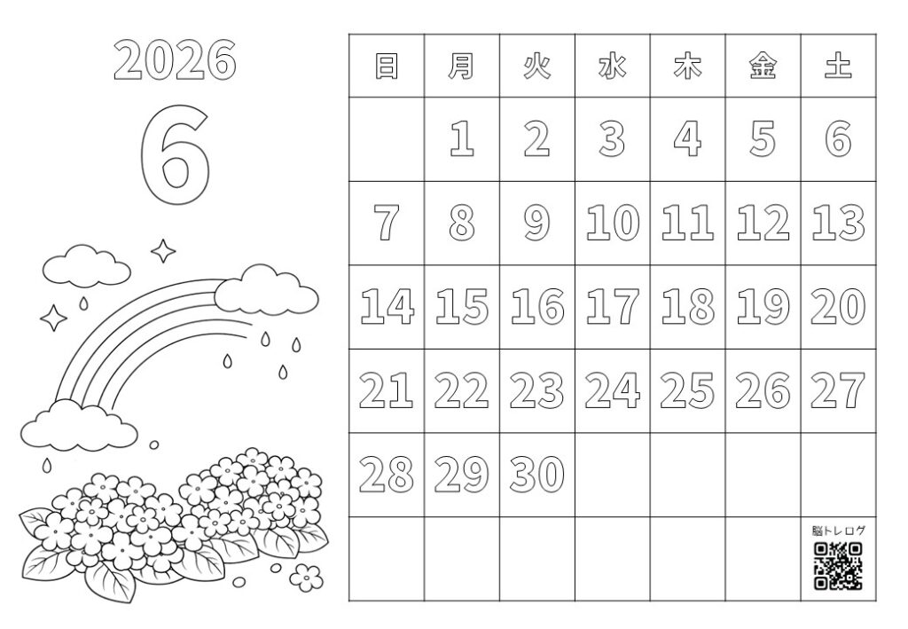 2026年6月のカレンダーと季節のイラストを組み合わせた塗り絵を作りました。