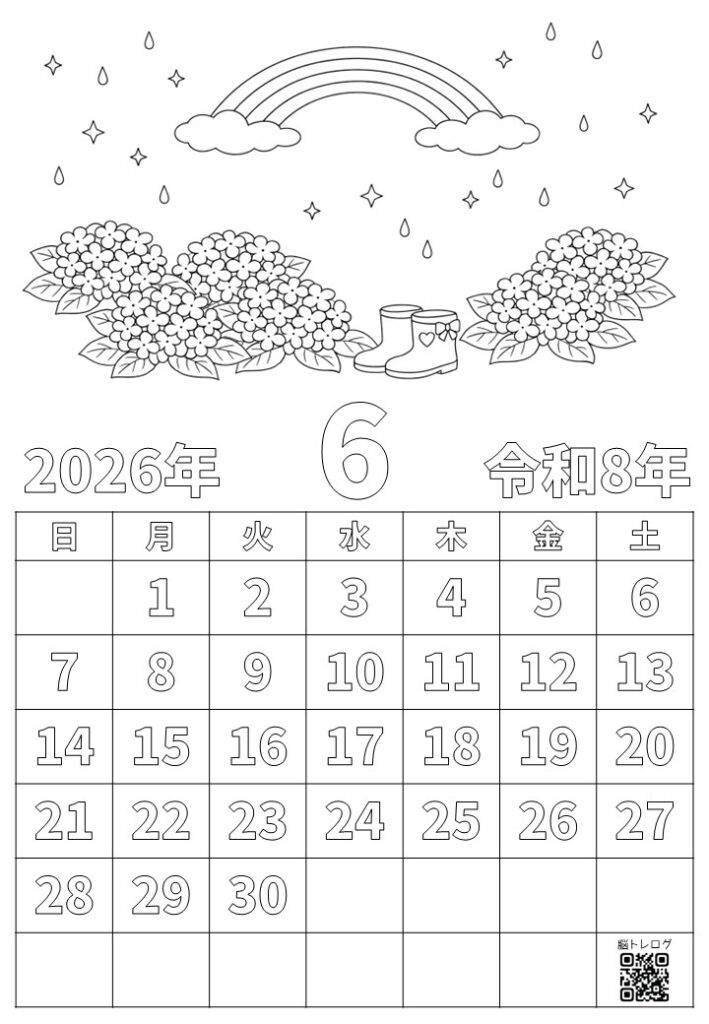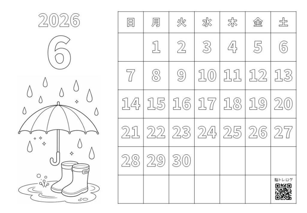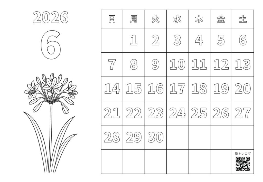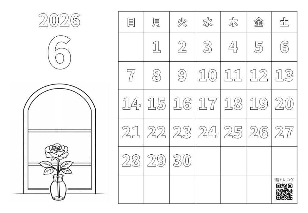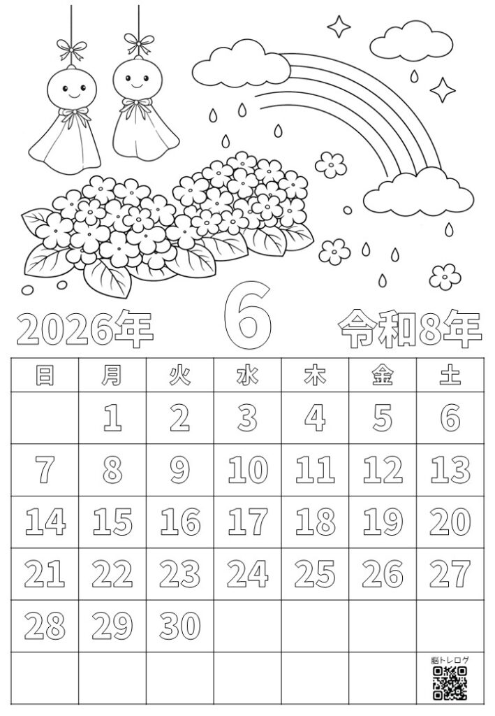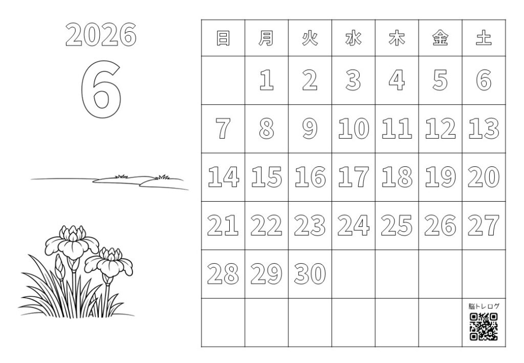 2026年6月のカレンダーと季節のイラストを組み合わせた塗り絵を作りました。