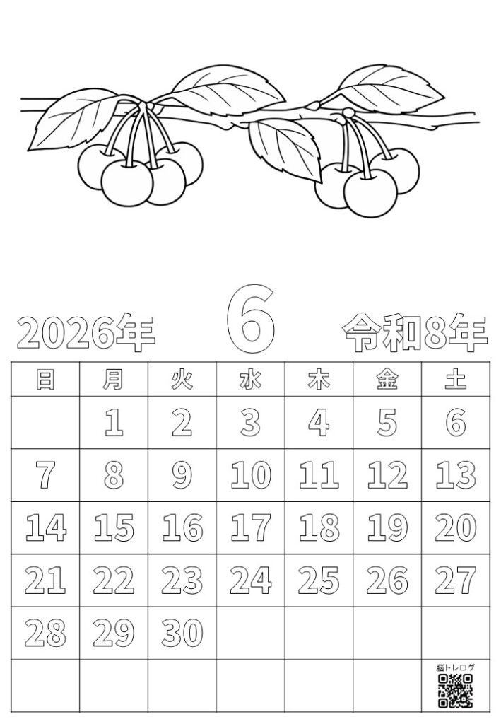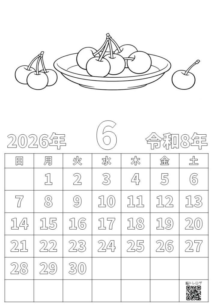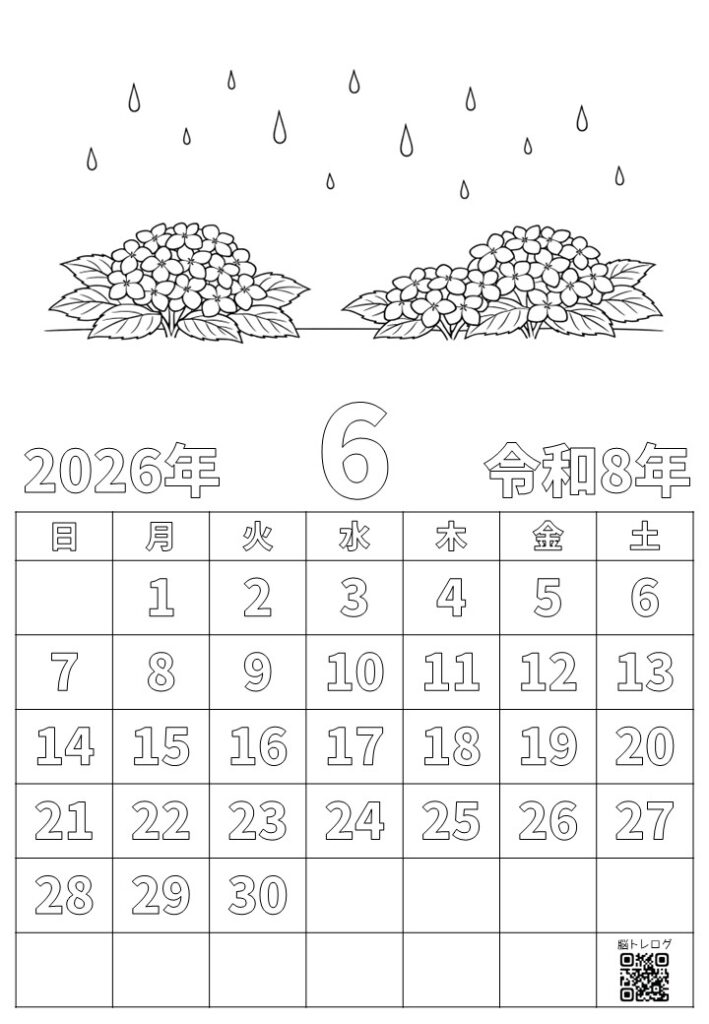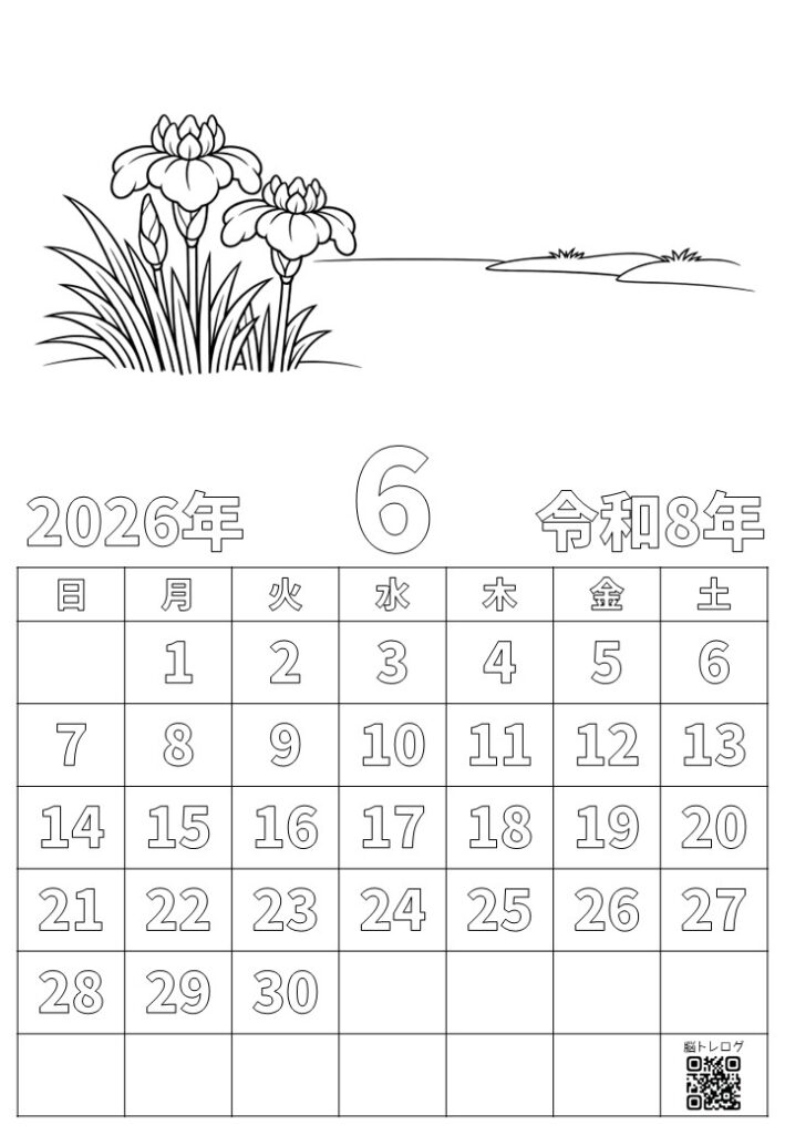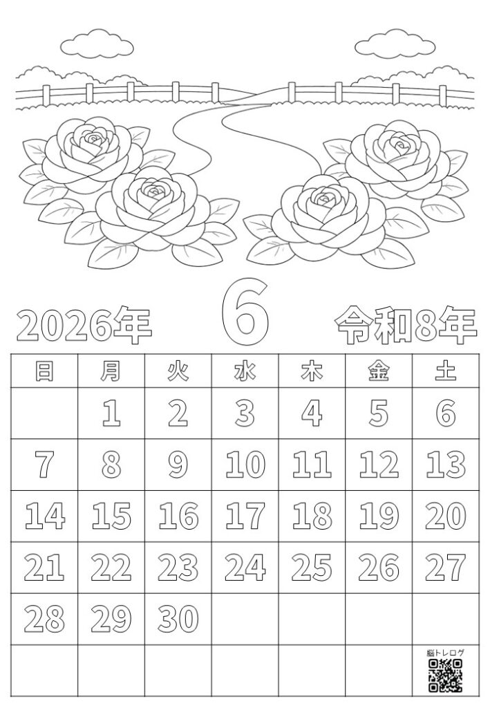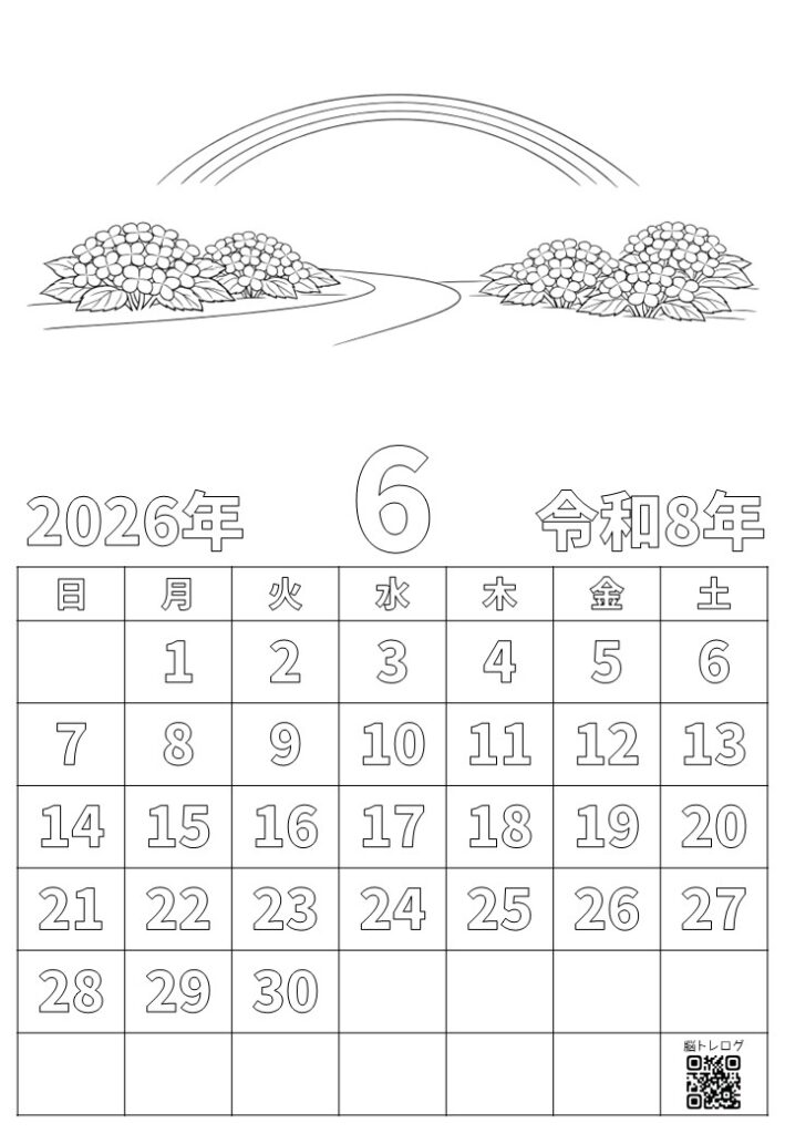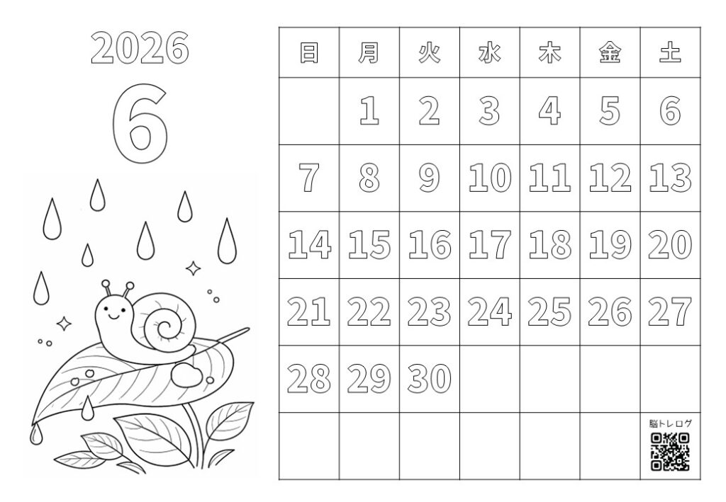 2026年6月のカレンダーと季節のイラストを組み合わせた塗り絵を作りました。
