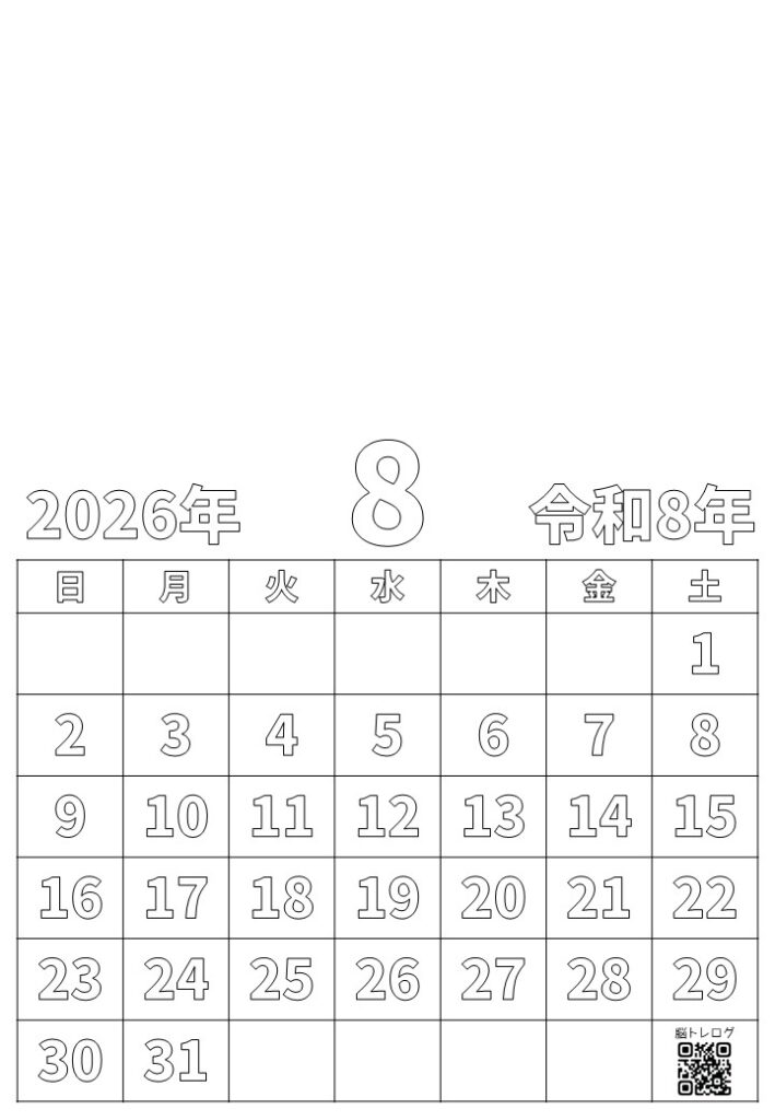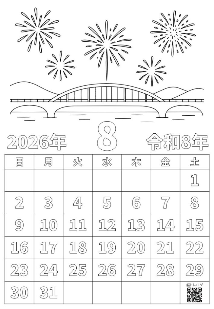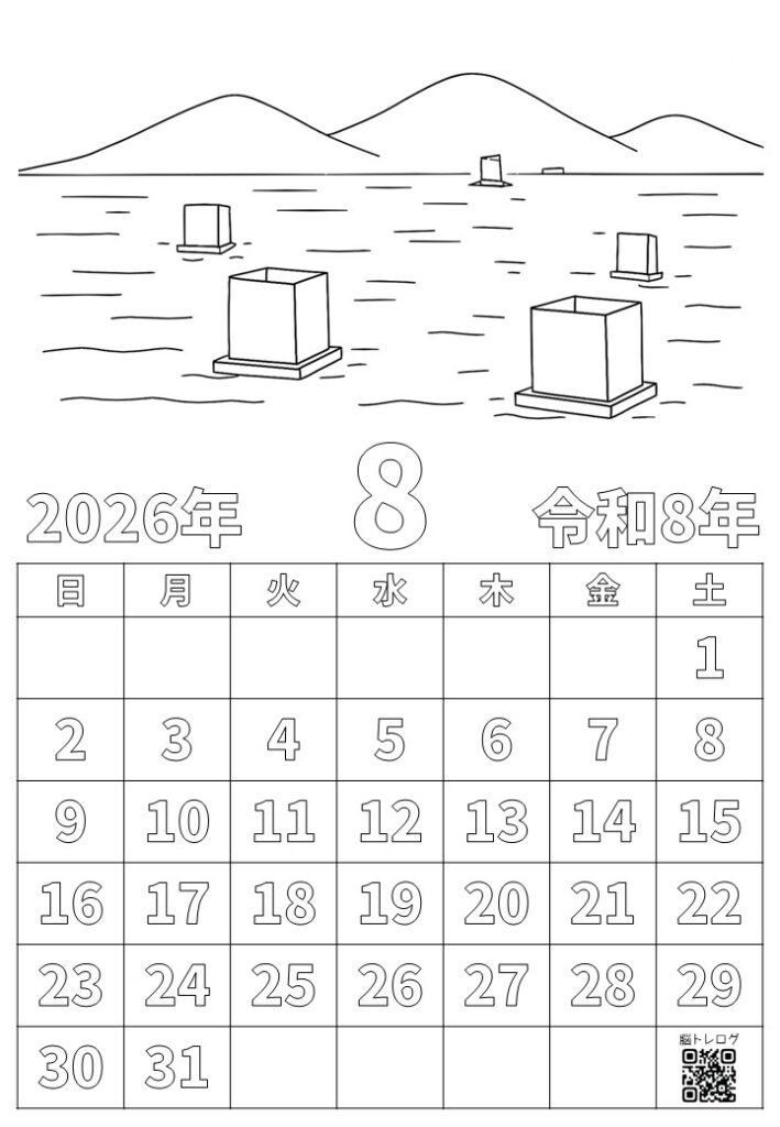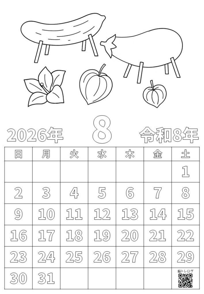 2026年8月のカレンダーと季節のイラストを組み合わせた塗り絵を作りました。