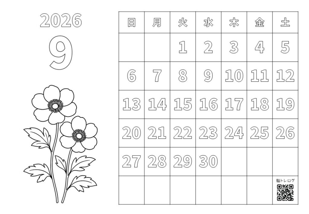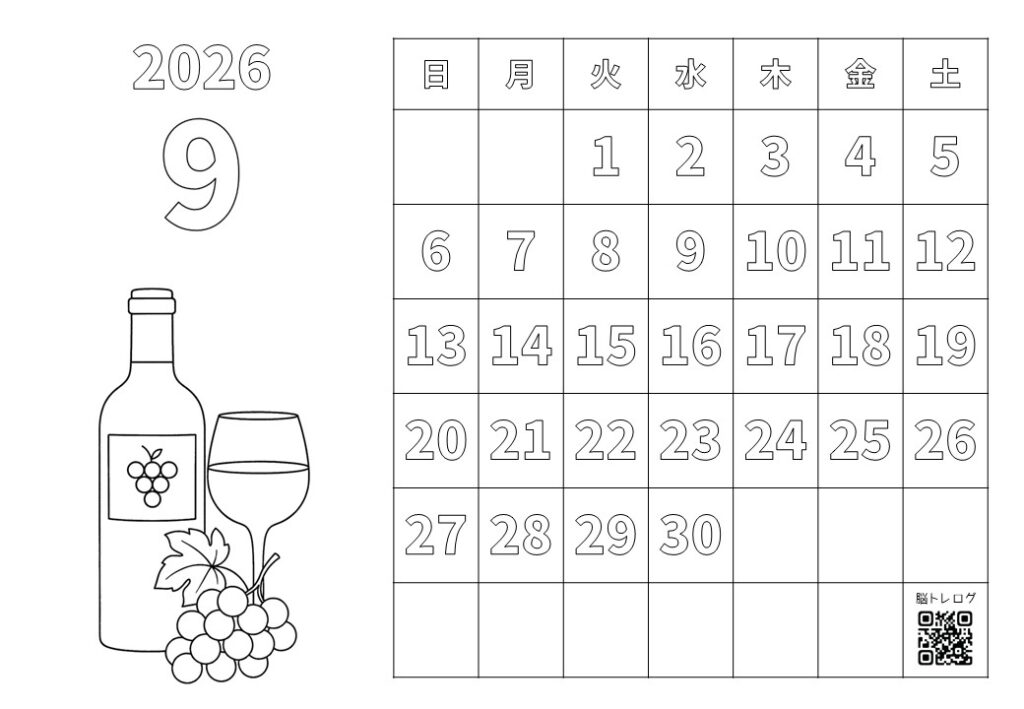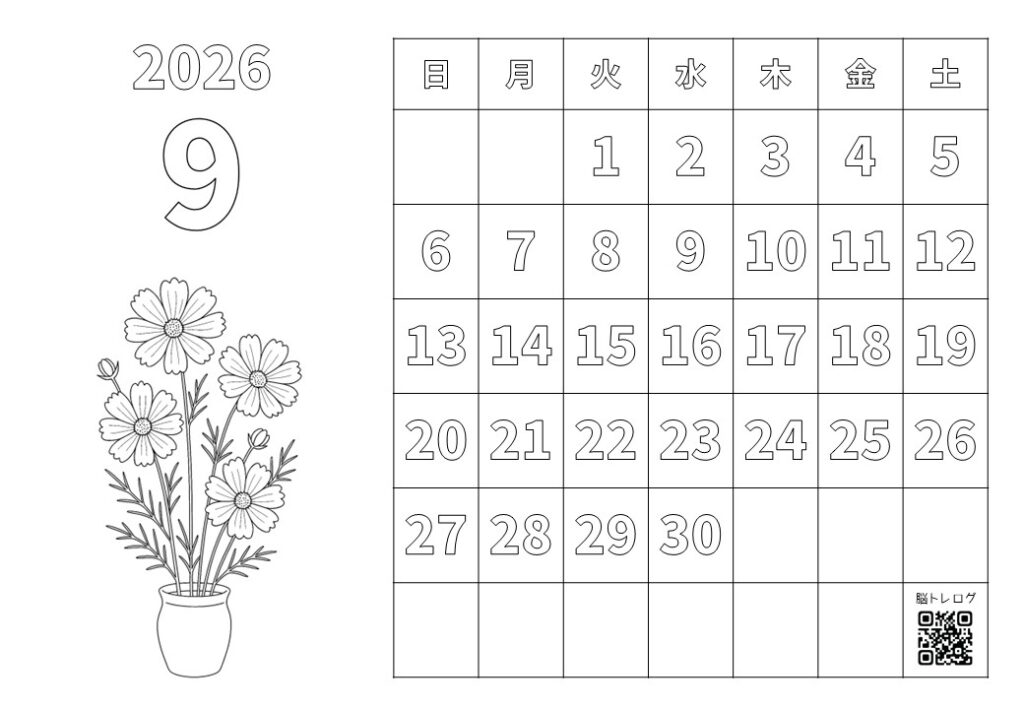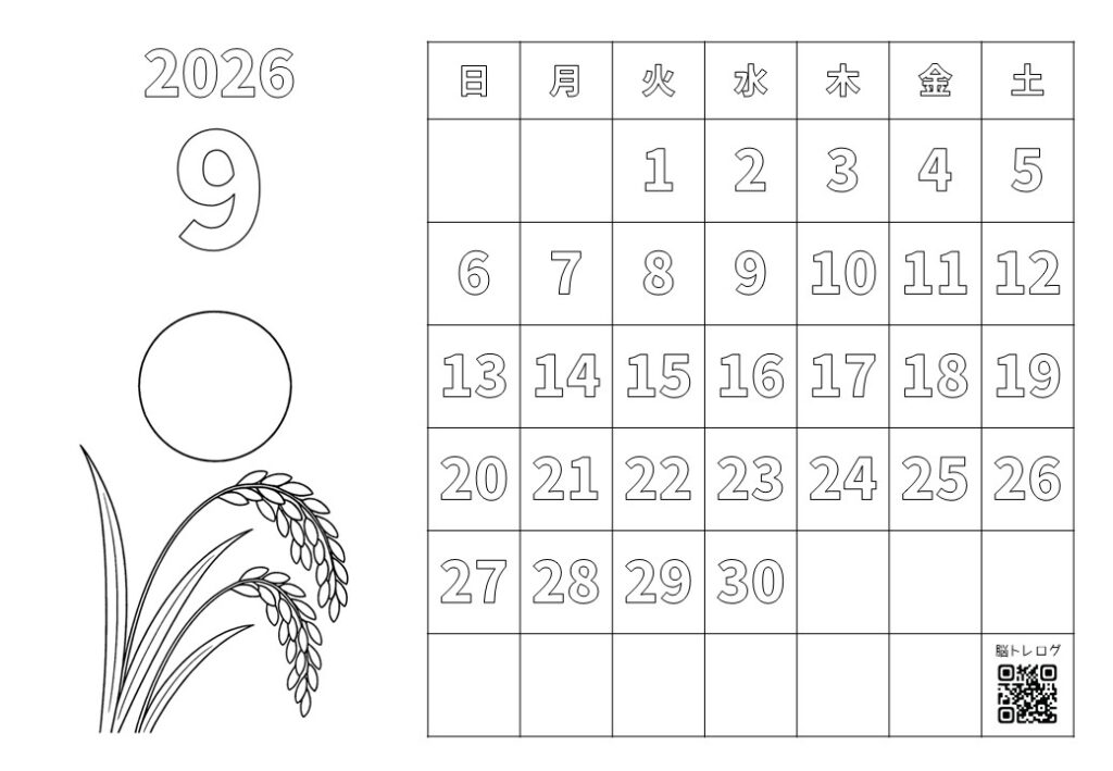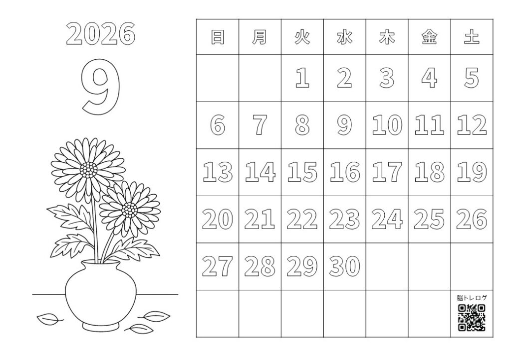 2026年9月のカレンダーと季節のイラストを組み合わせた塗り絵を作りました。