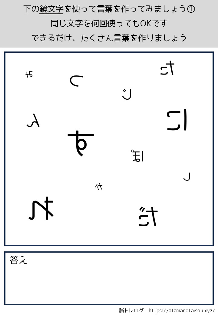 バラバラに配置された「鏡文字」を使って、言葉を作成する脳トレプリントです。