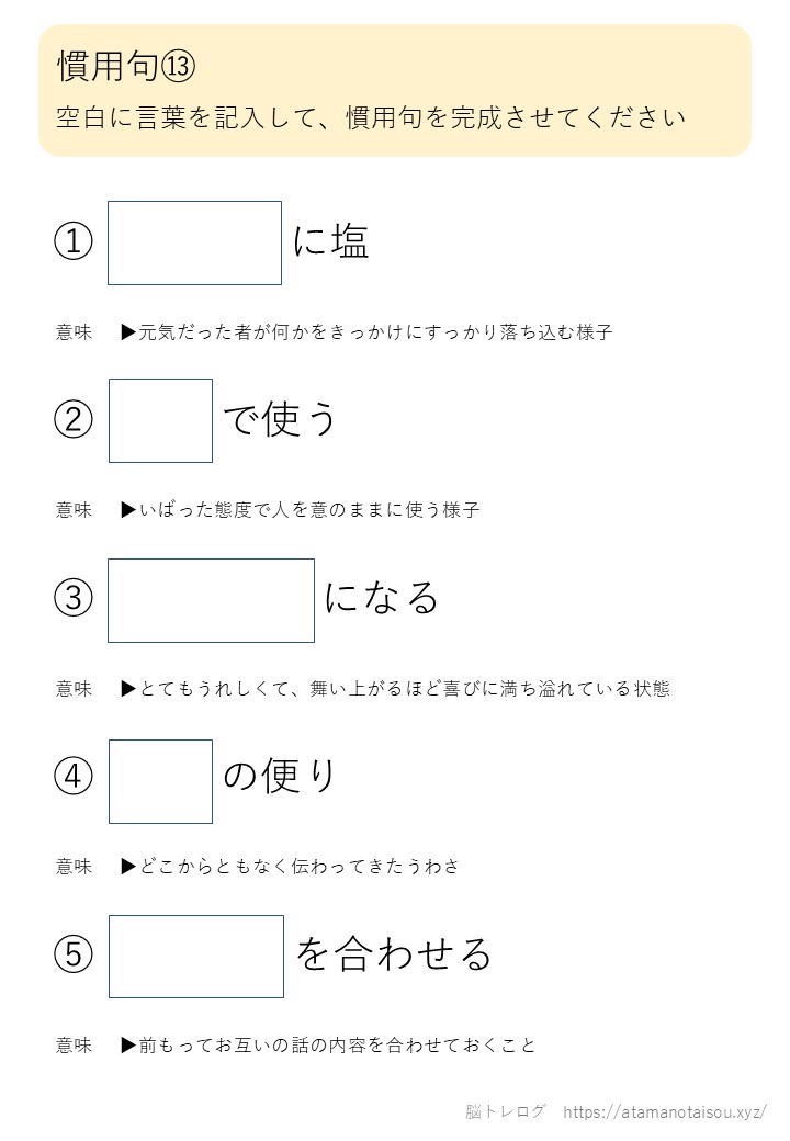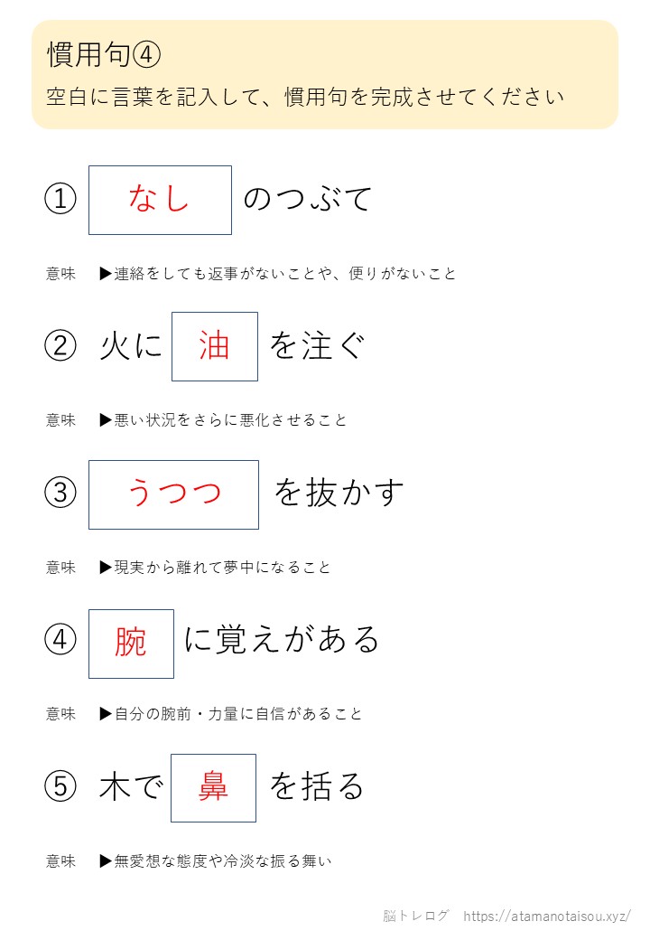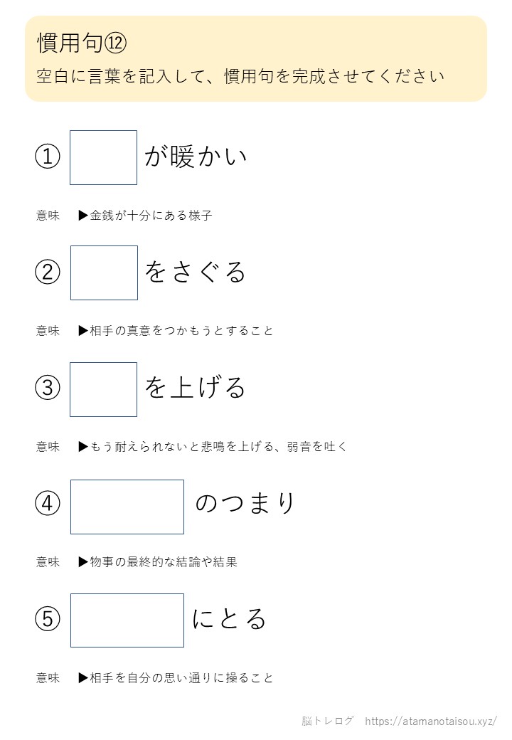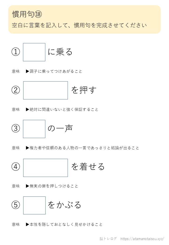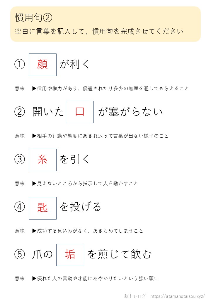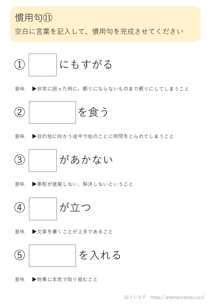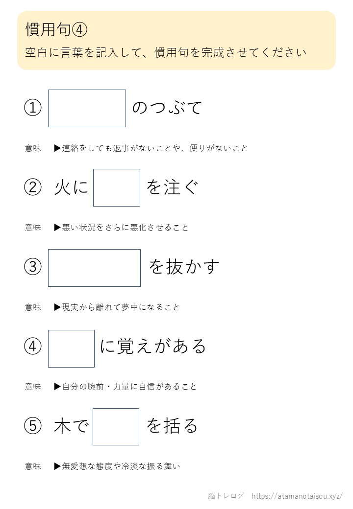 認知症予防などに使える高齢者向けの脳トレプリント「慣用句の穴埋め」を無料でダウンロードしていただけるページです。