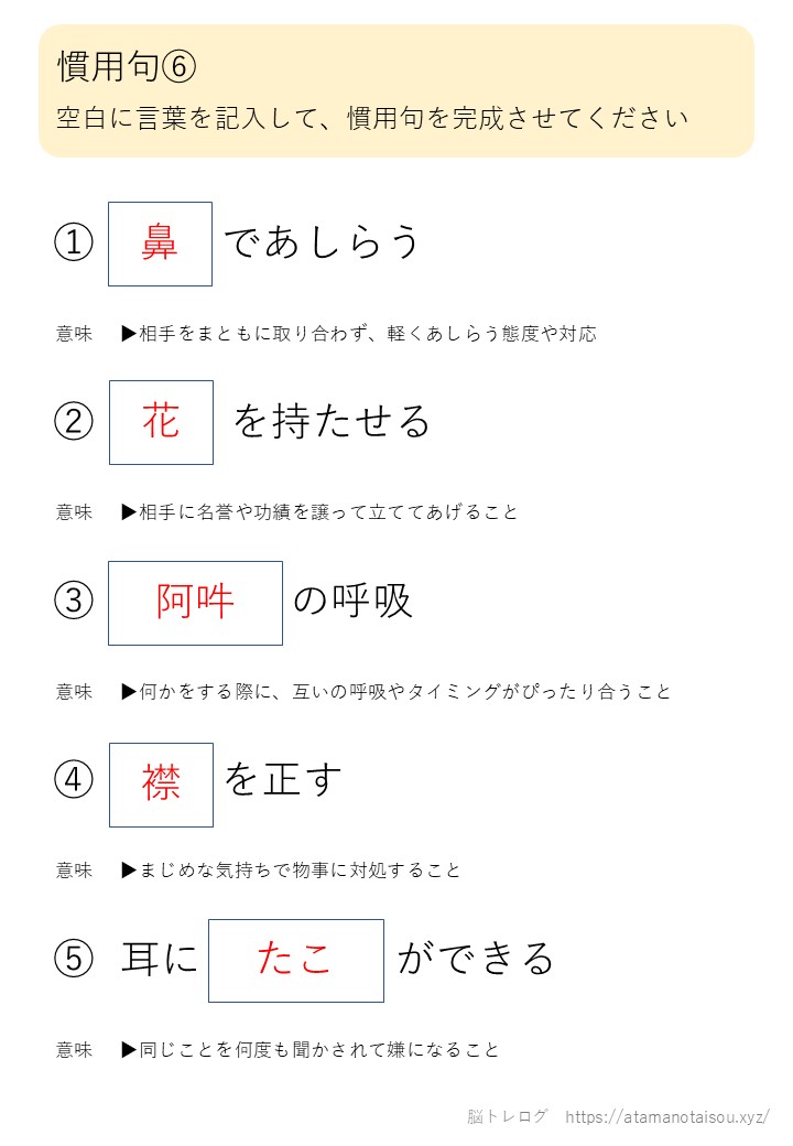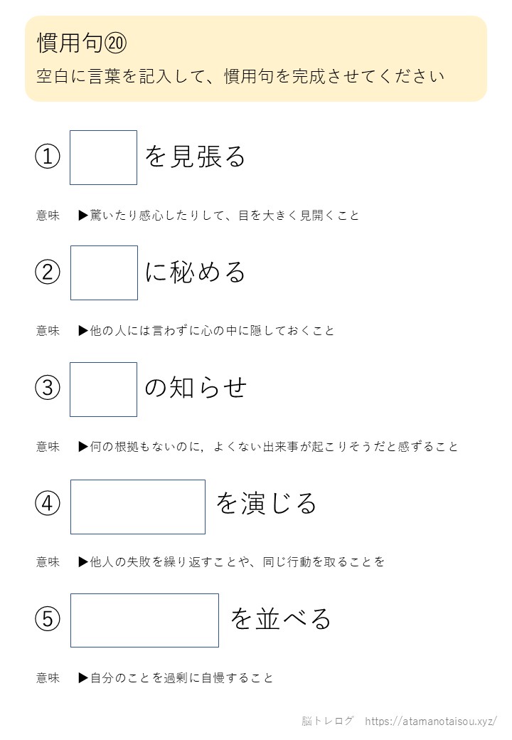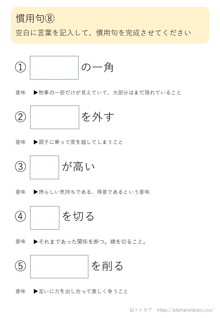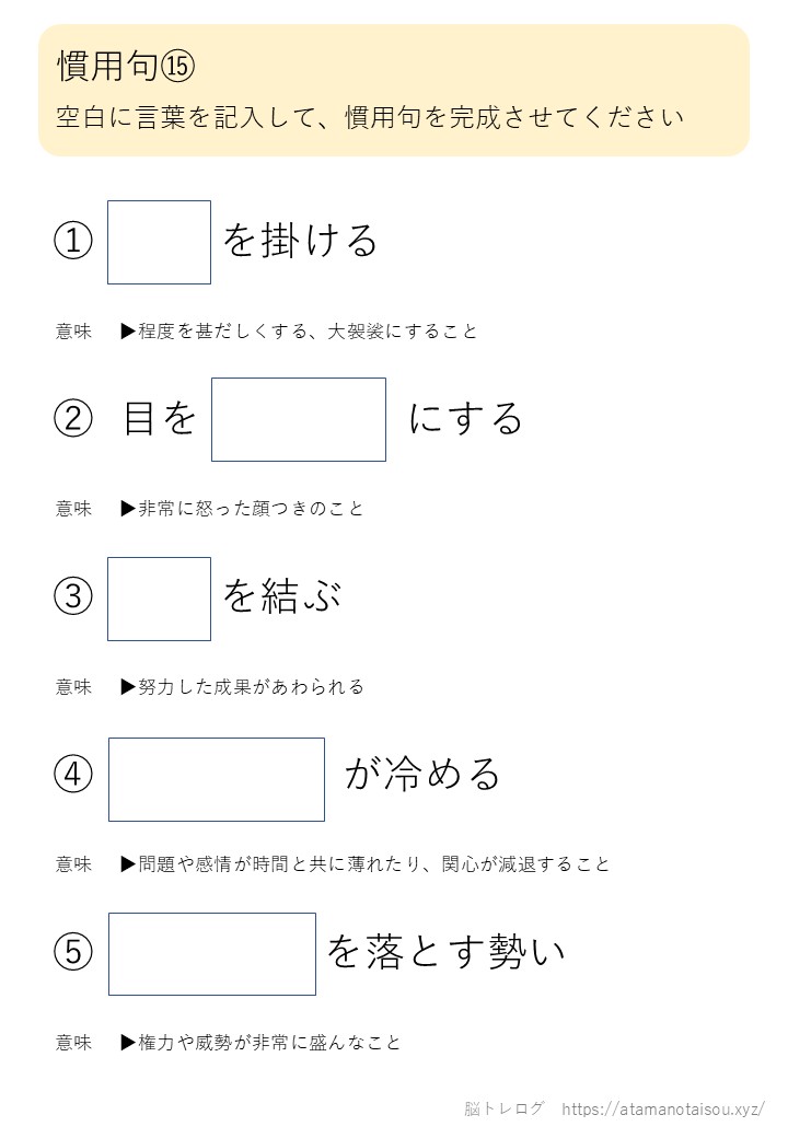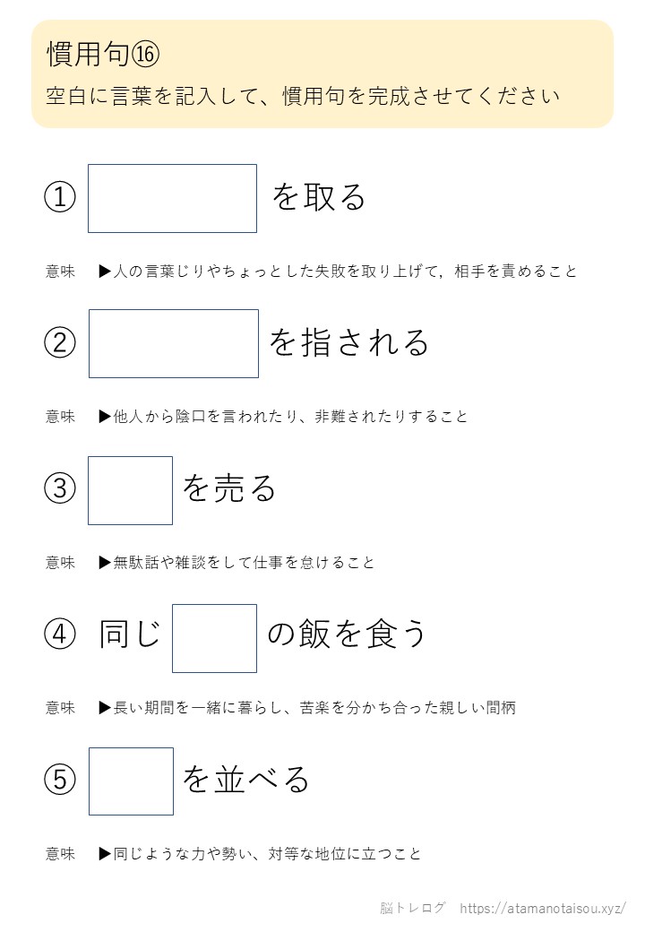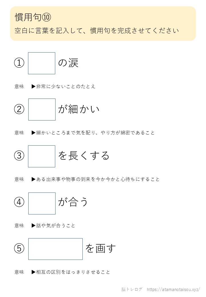 認知症予防などに使える高齢者向けの脳トレプリント「慣用句の穴埋め」を無料でダウンロードしていただけるページです。