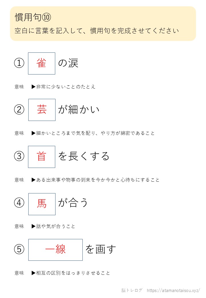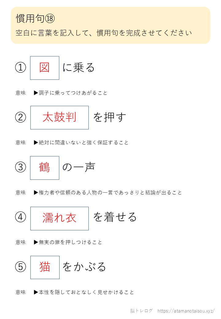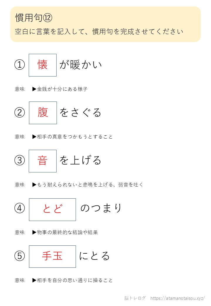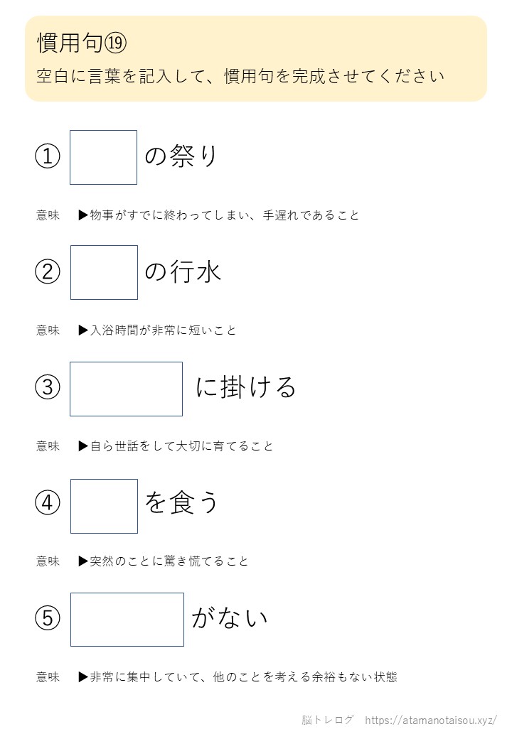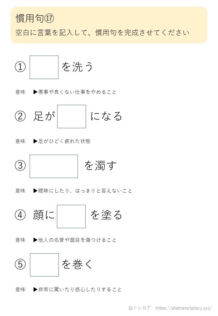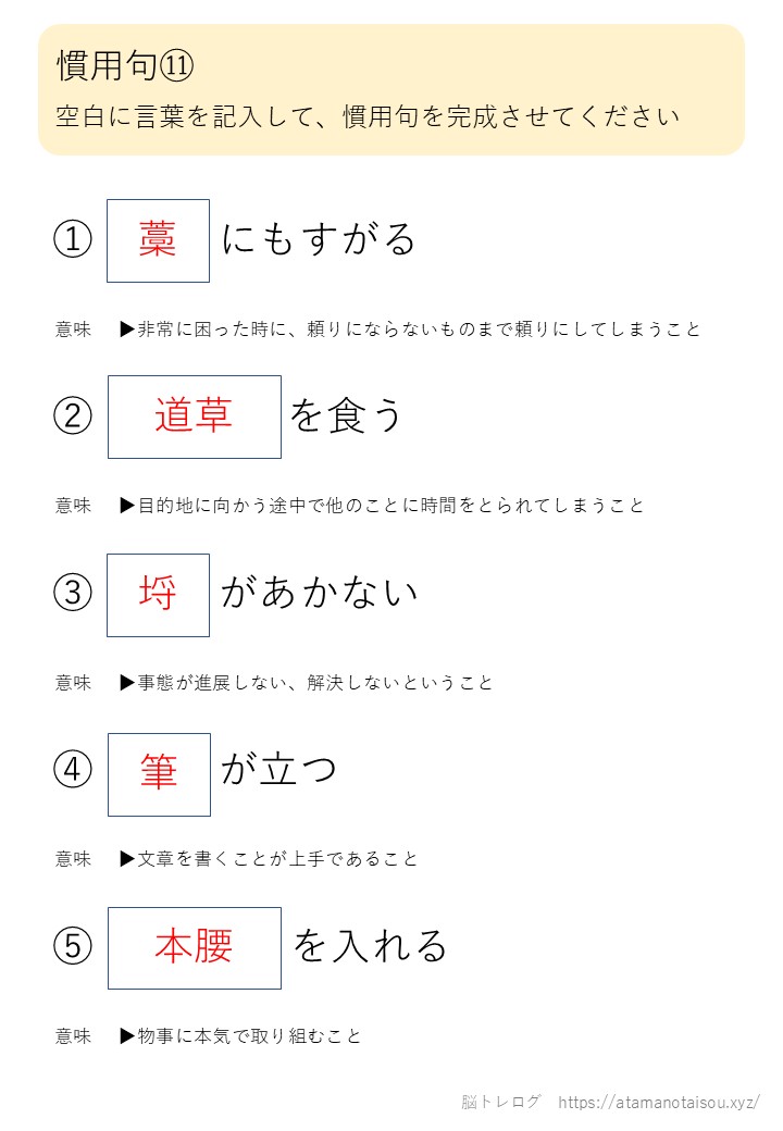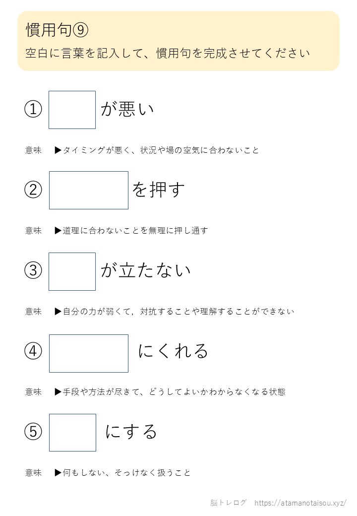 認知症予防などに使える高齢者向けの脳トレプリント「慣用句の穴埋め」を無料でダウンロードしていただけるページです。