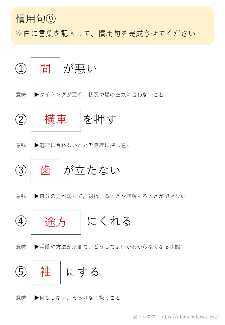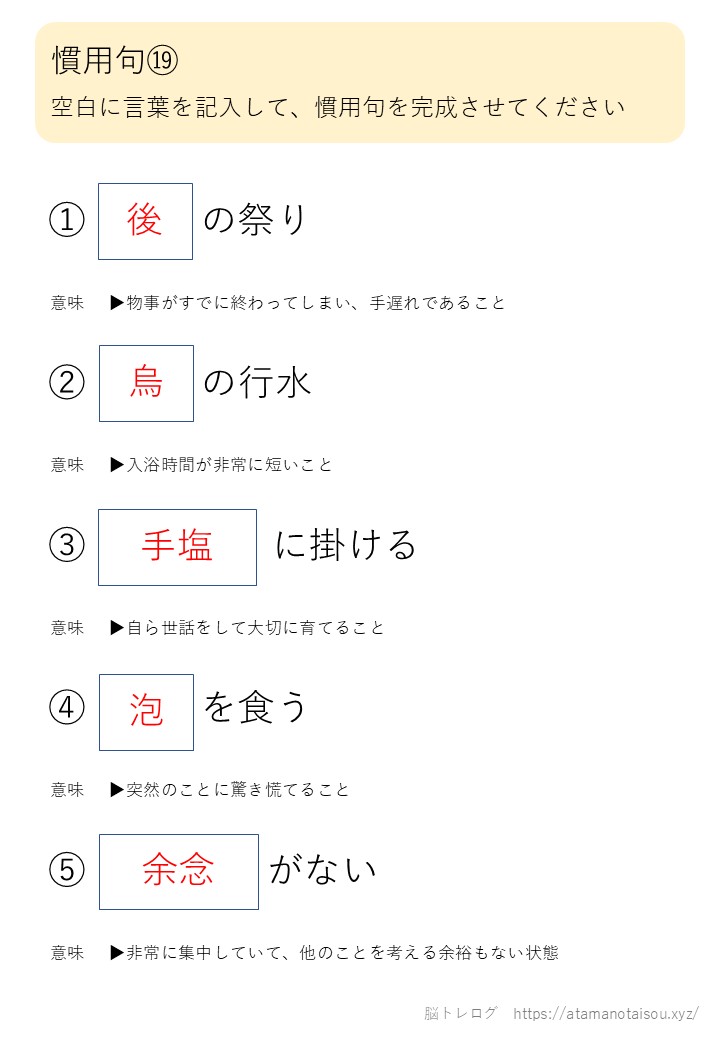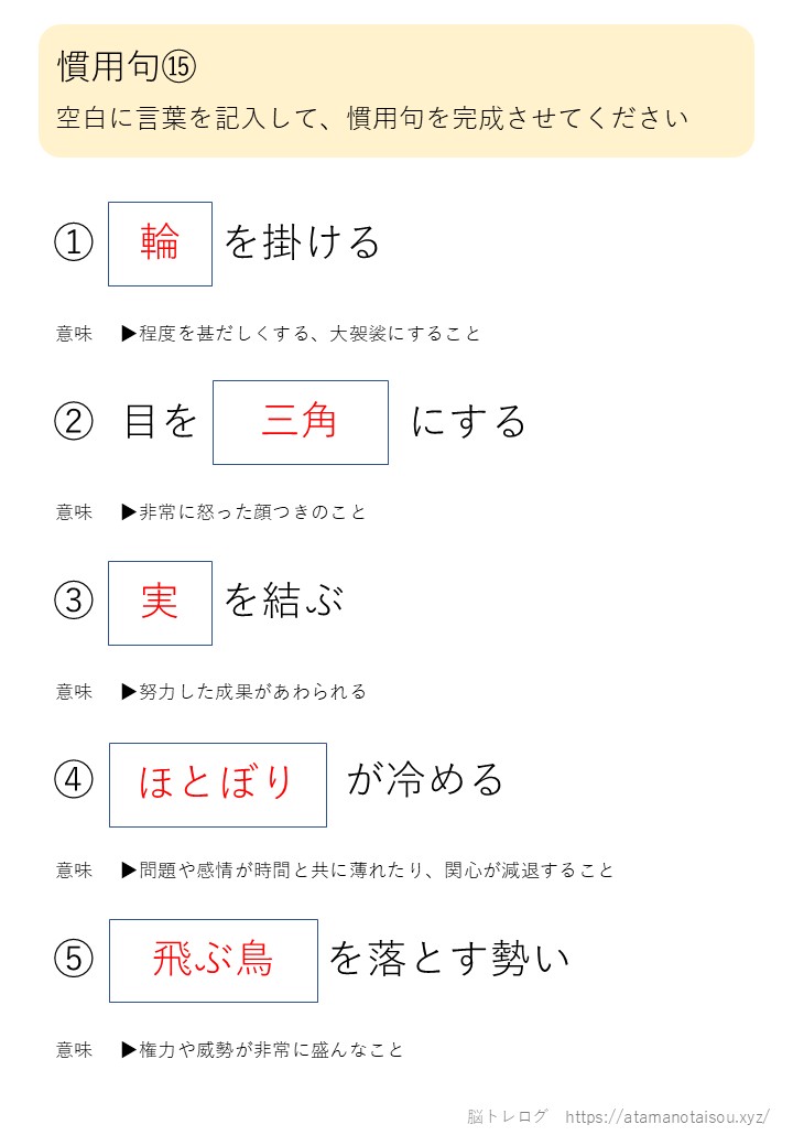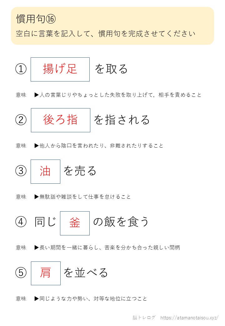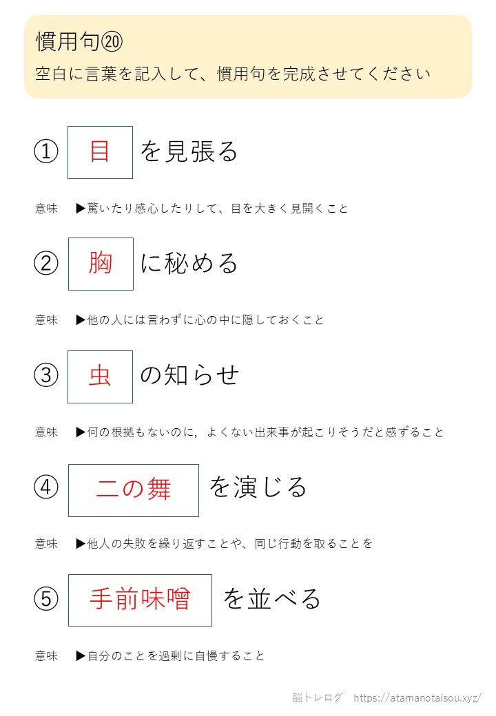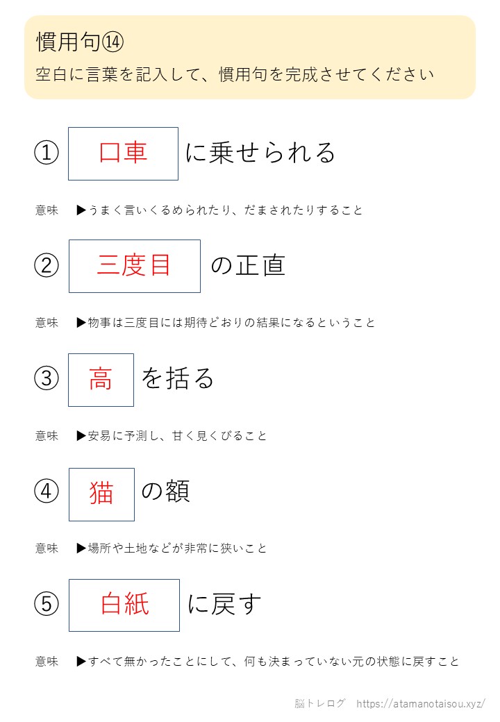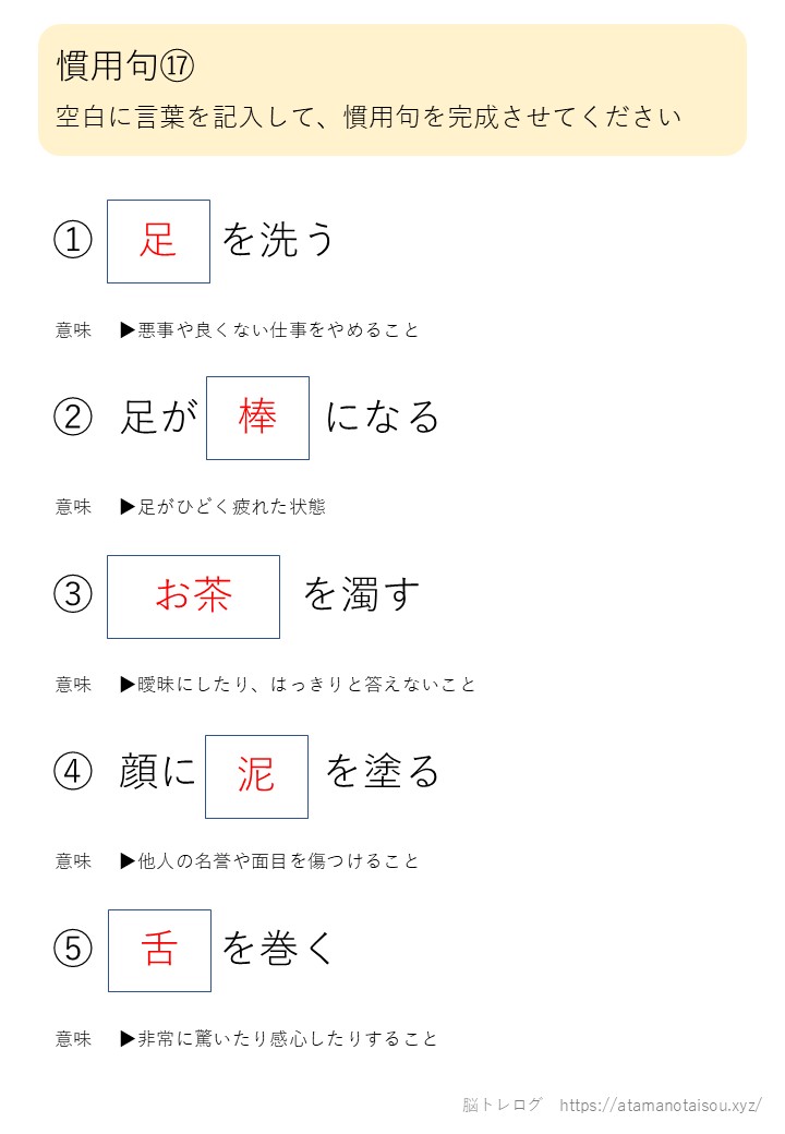 認知症予防などに使える高齢者向けの脳トレプリント「慣用句の穴埋め」を無料でダウンロードしていただけるページです。