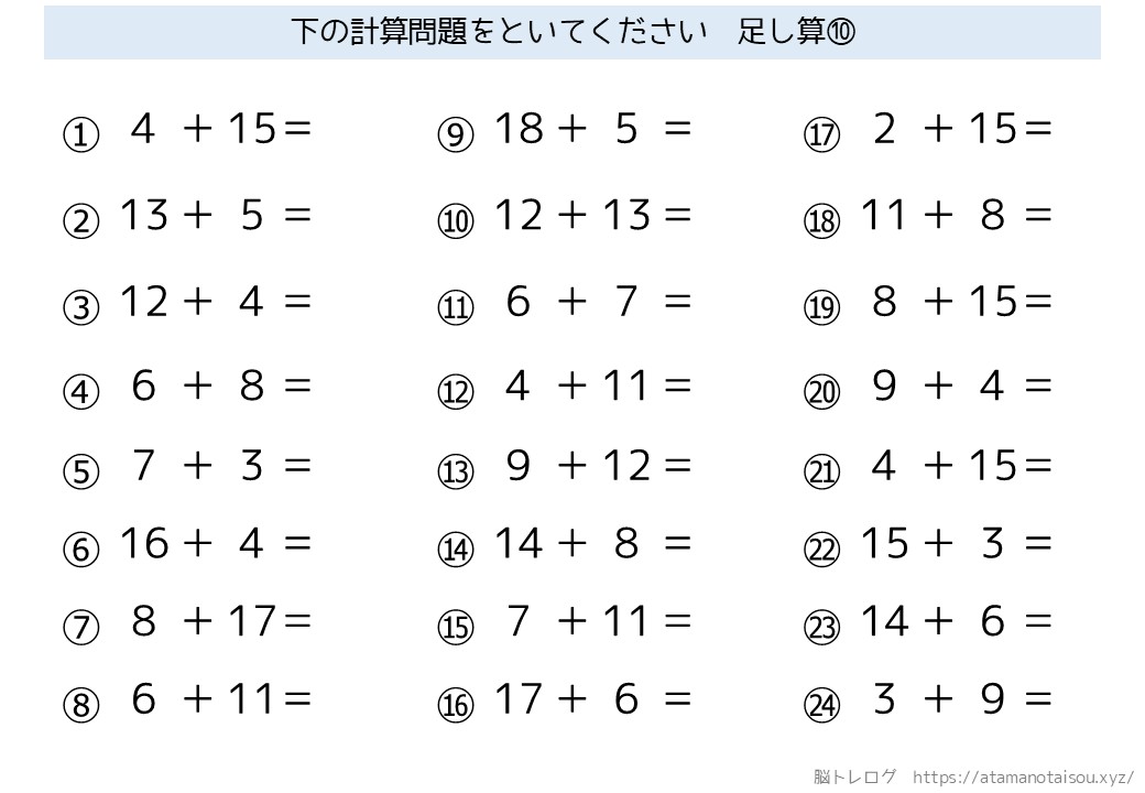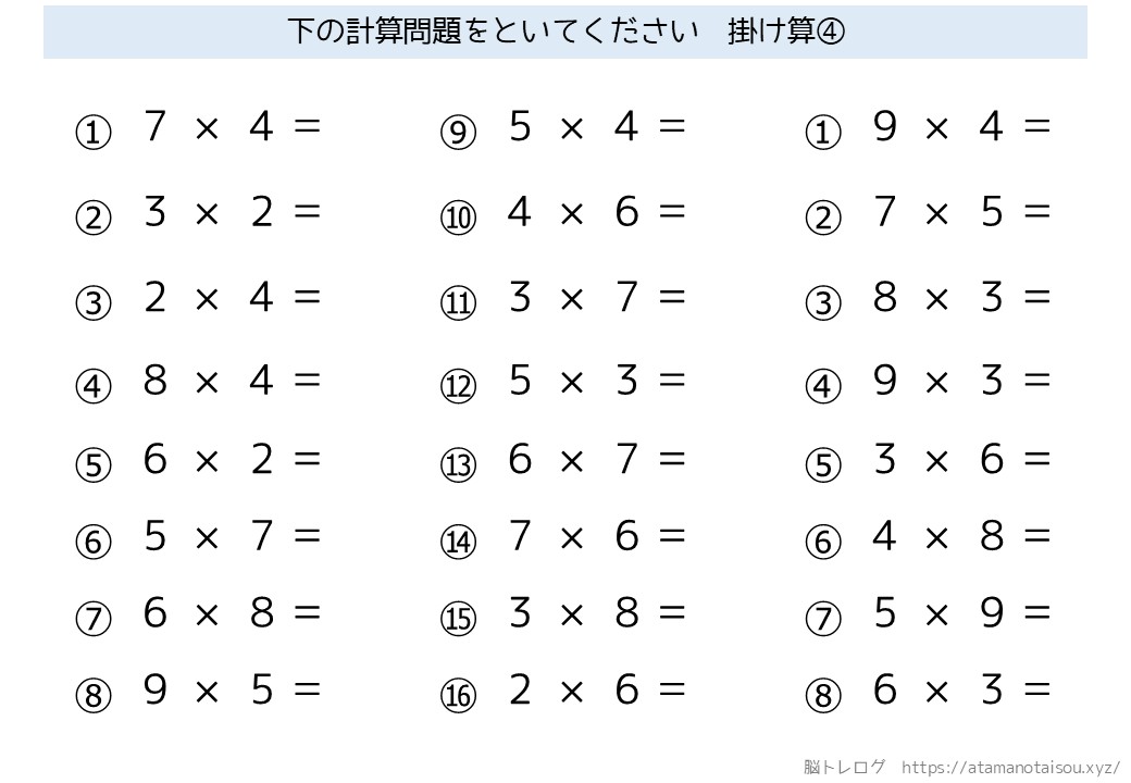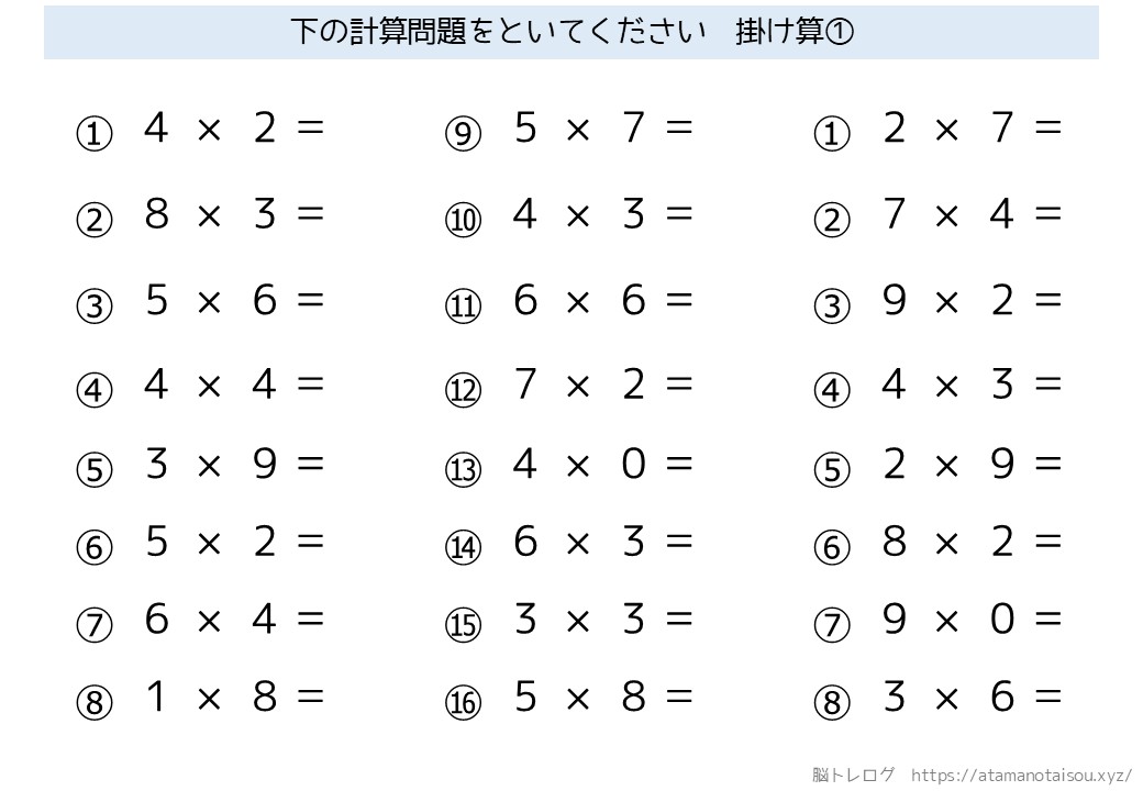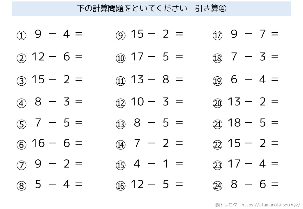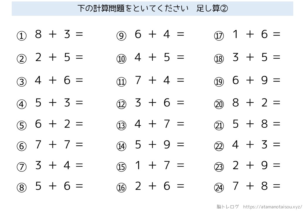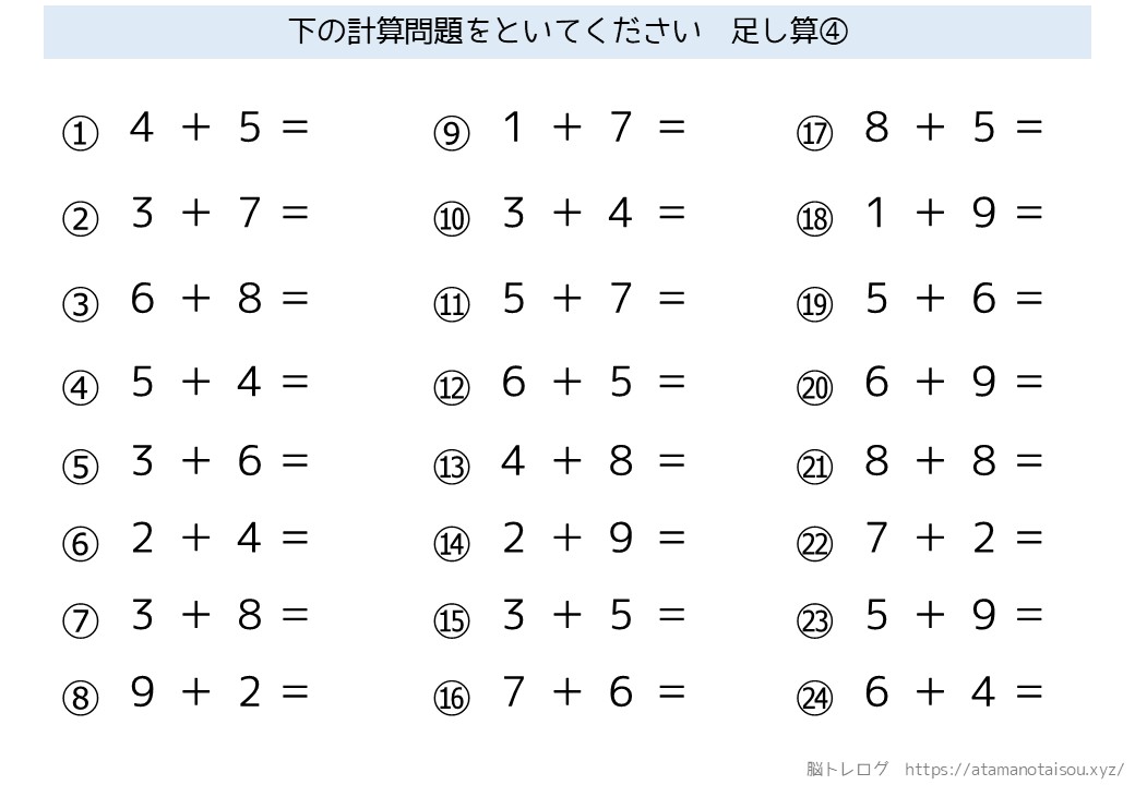 認知症予防などに使える高齢者向けの脳トレプリント「シンプルな計算」を無料でダウンロードしていただけるページです。