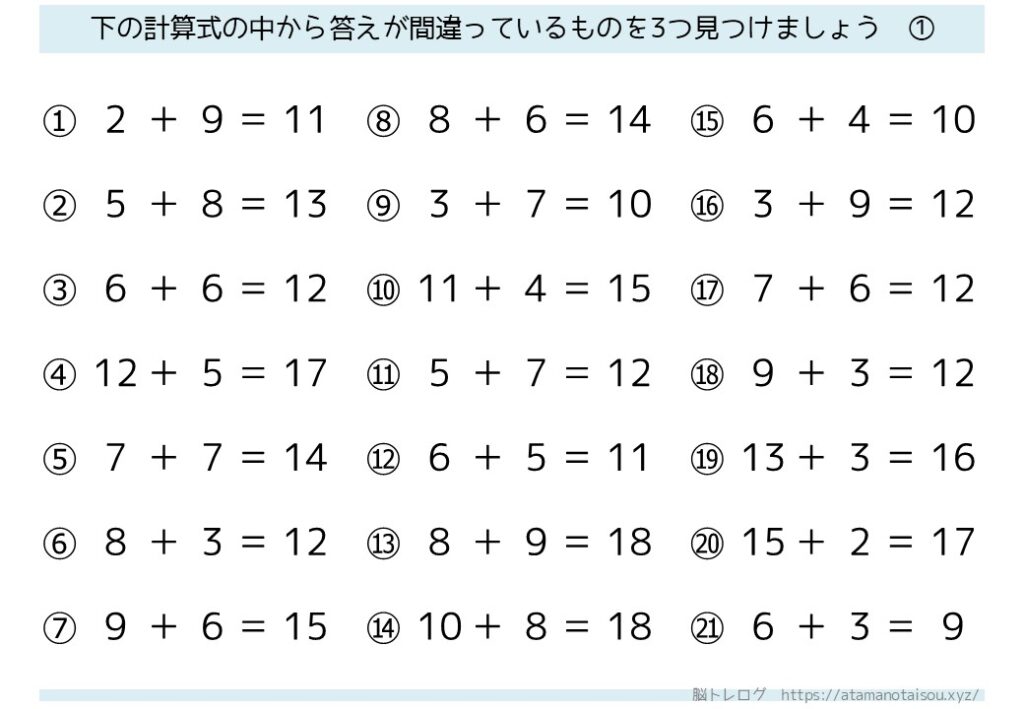 このように、回答まで記入されたプリントを作成しましたので、記載された計算式の中から、答えが間違っているものを3つ見つけてください。