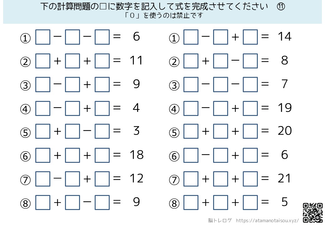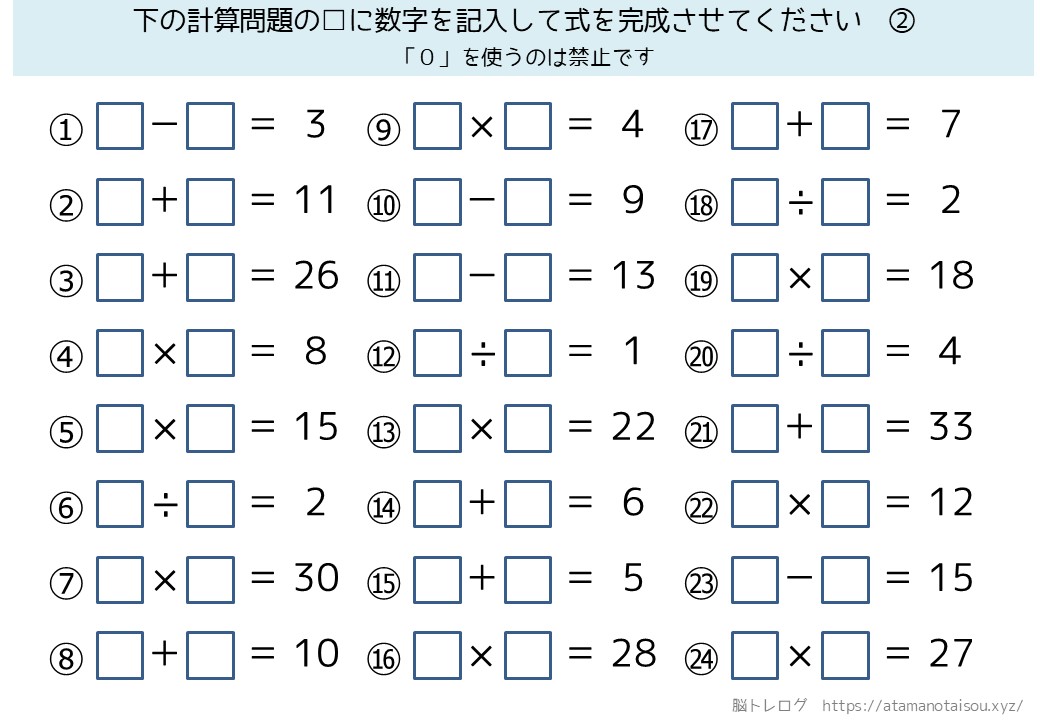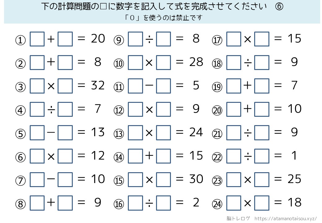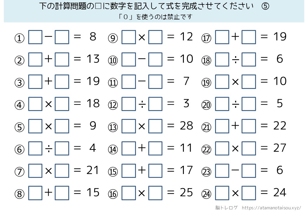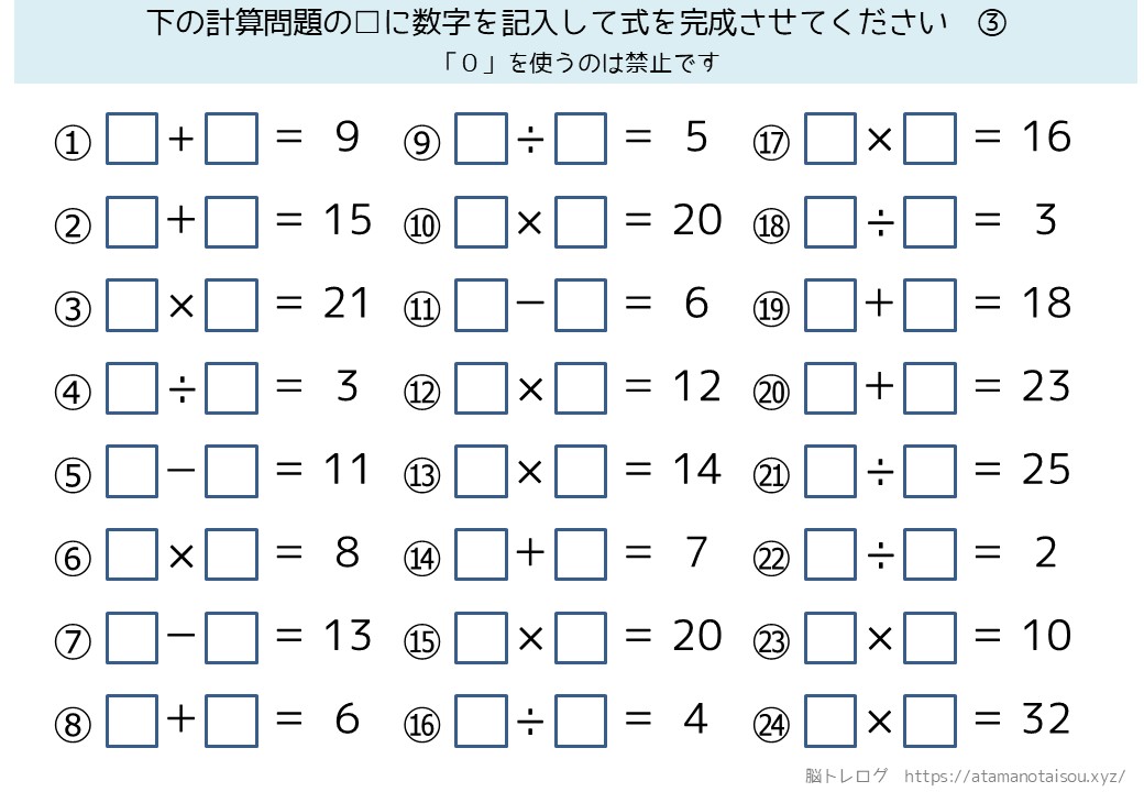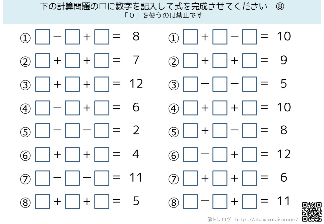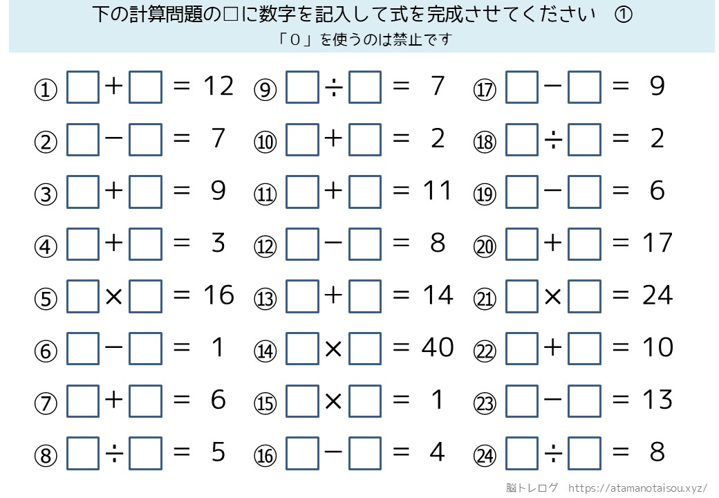 認知症予防などに使える高齢者向けの脳トレプリント「計算式作成」を無料でダウンロードしていただけるページです。