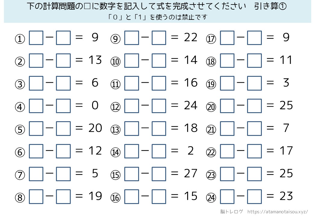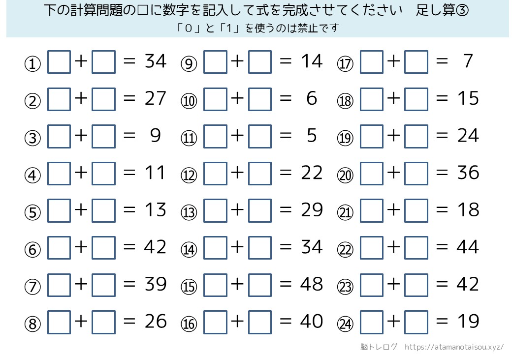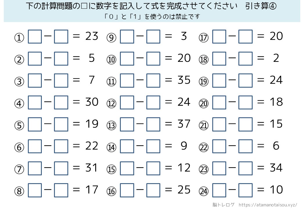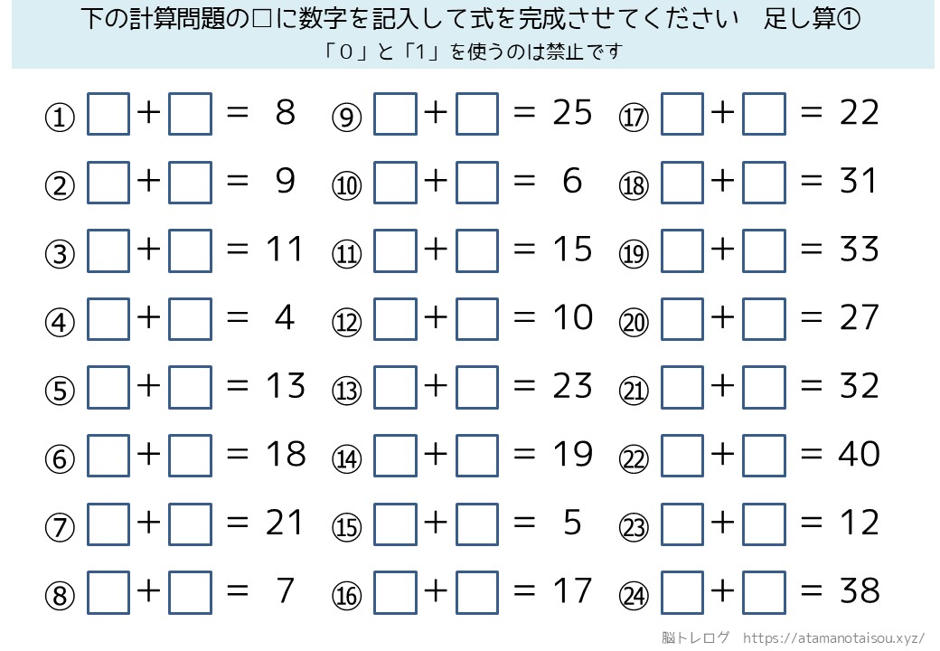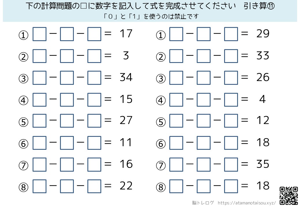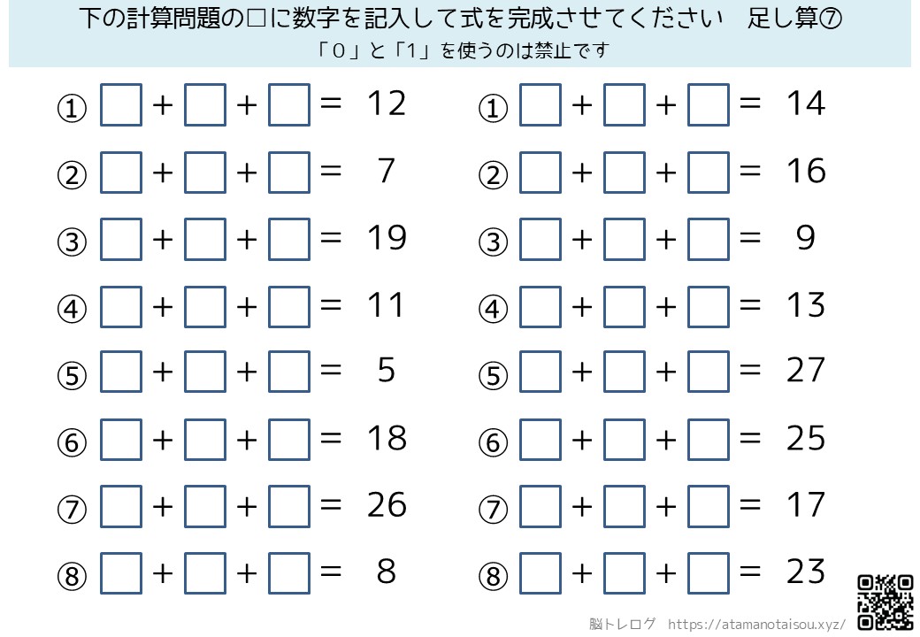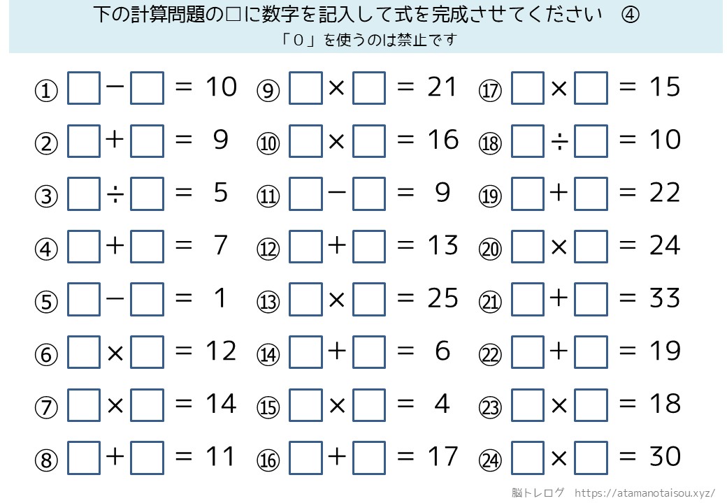 認知症予防などに使える高齢者向けの脳トレプリント「計算式作成」を無料でダウンロードしていただけるページです。