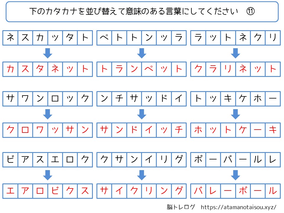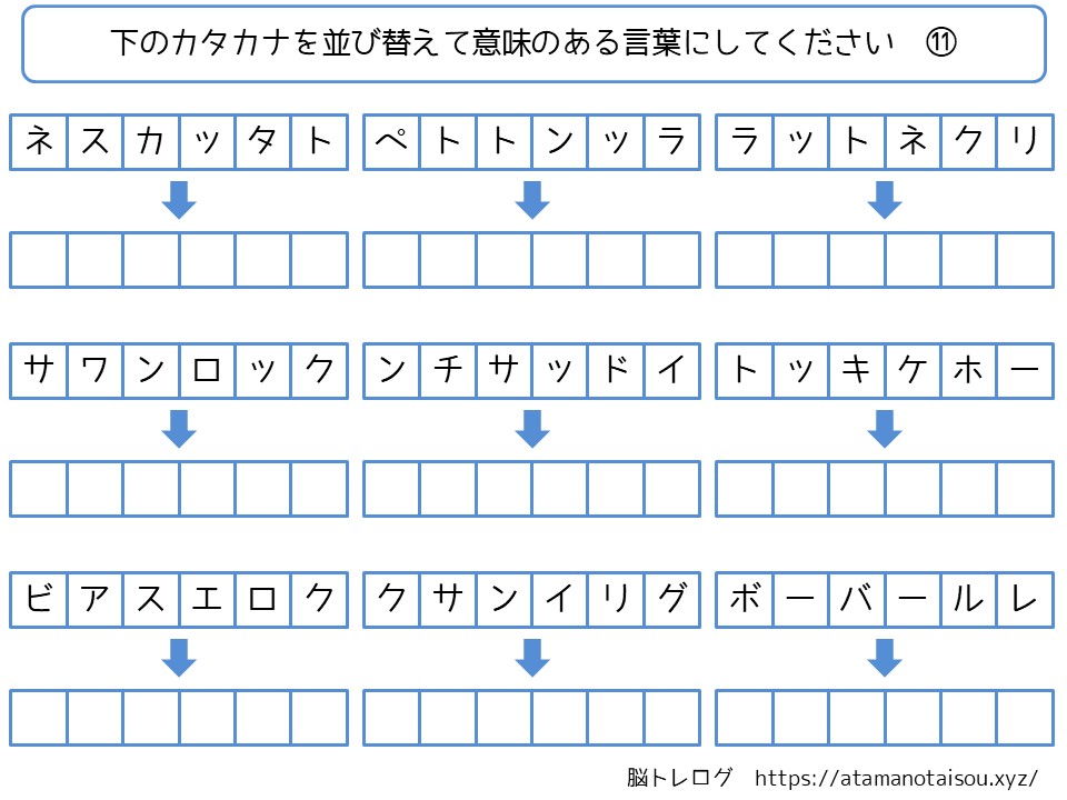 認知症予防などに使える高齢者向けの脳トレプリント「カタカナの並び替え」を無料でダウンロードしていただけるページです。