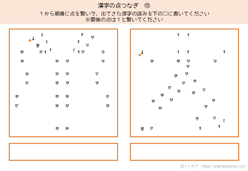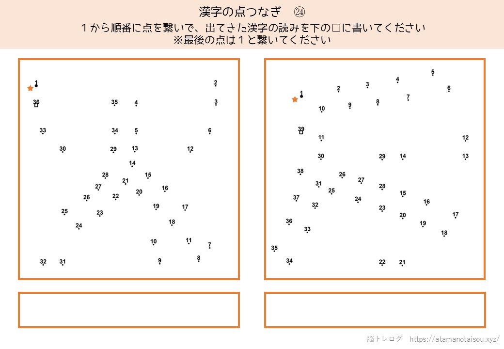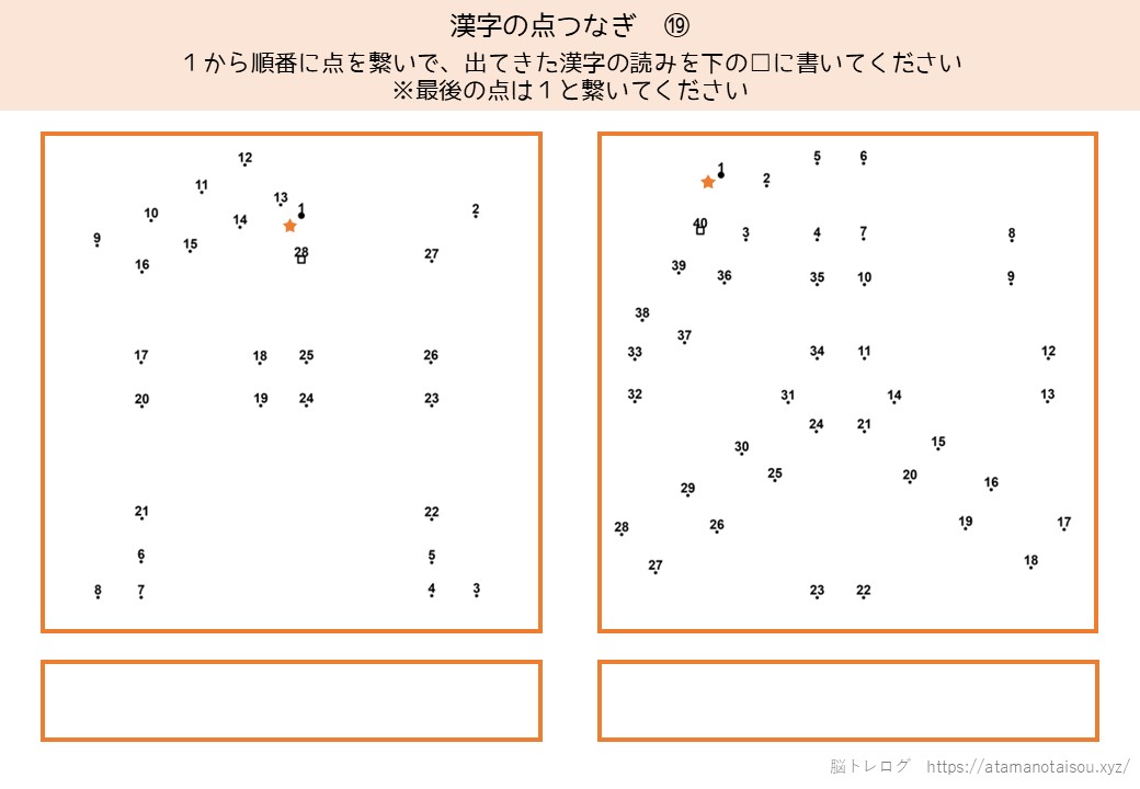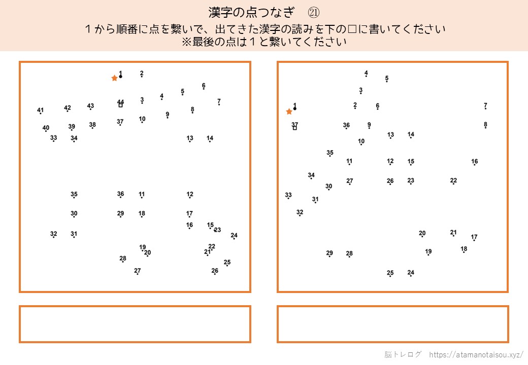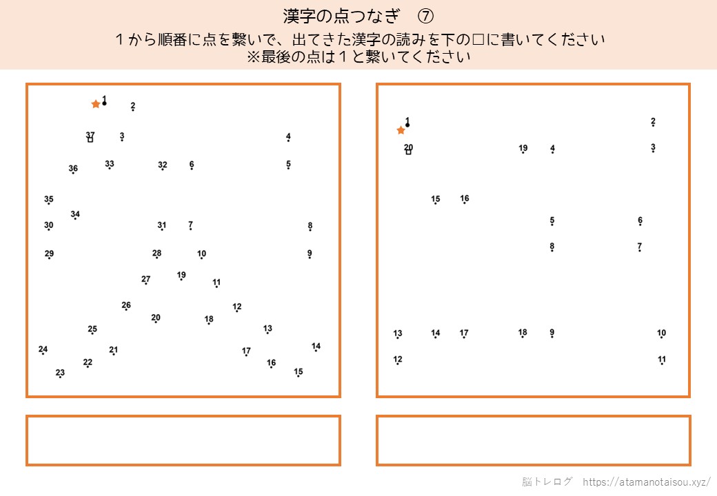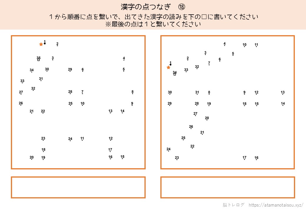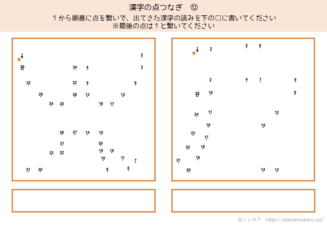 認知症予防やレクリエーションなどに使える高齢者向けの脳トレプリント「漢字の点つなぎ」を無料でダウンロードしていただけるページです。
