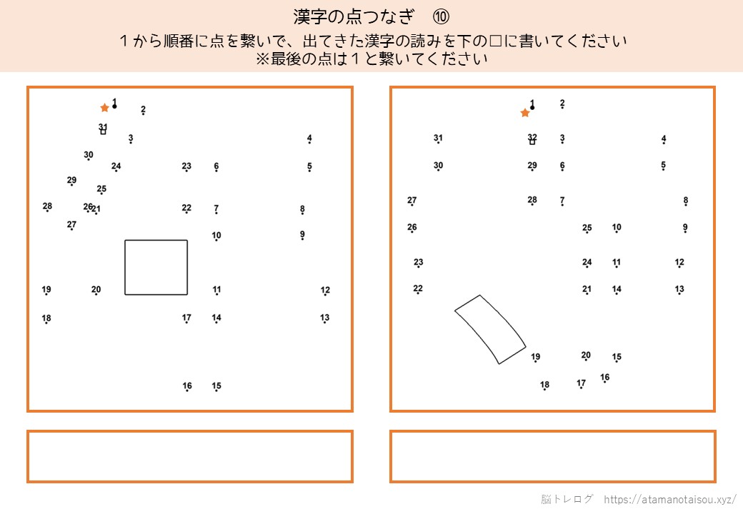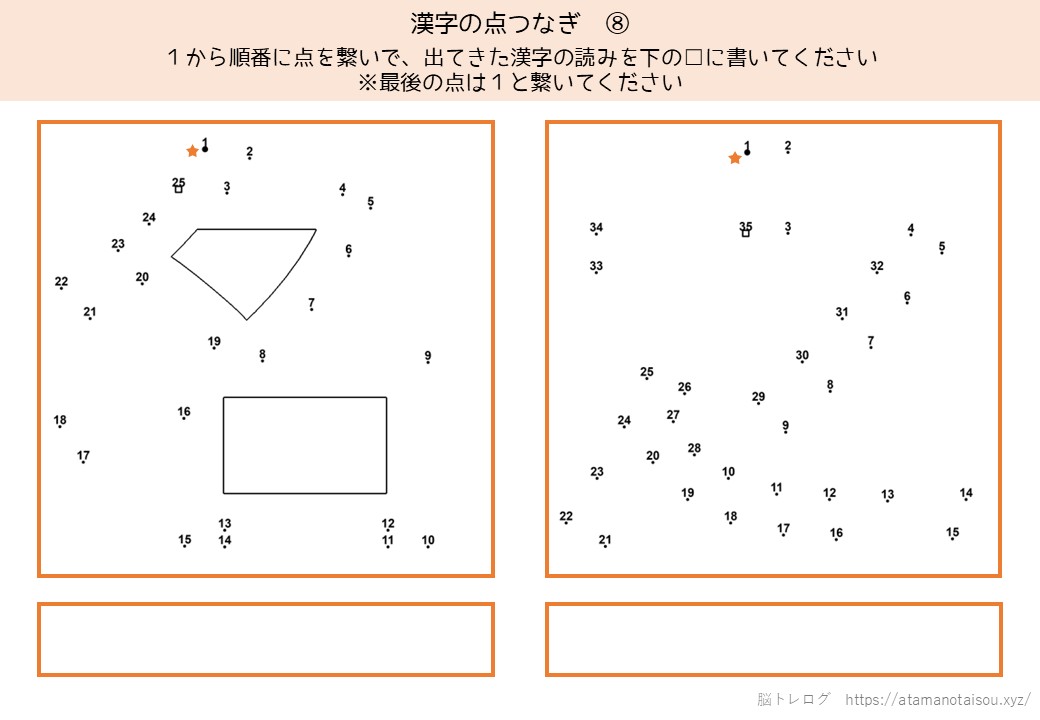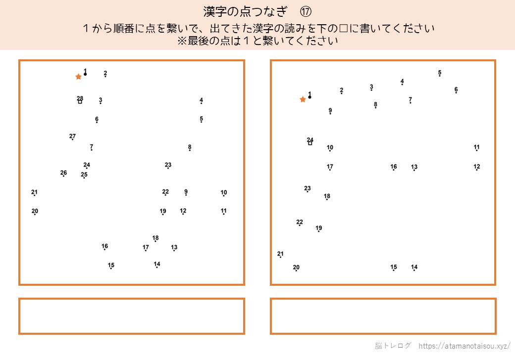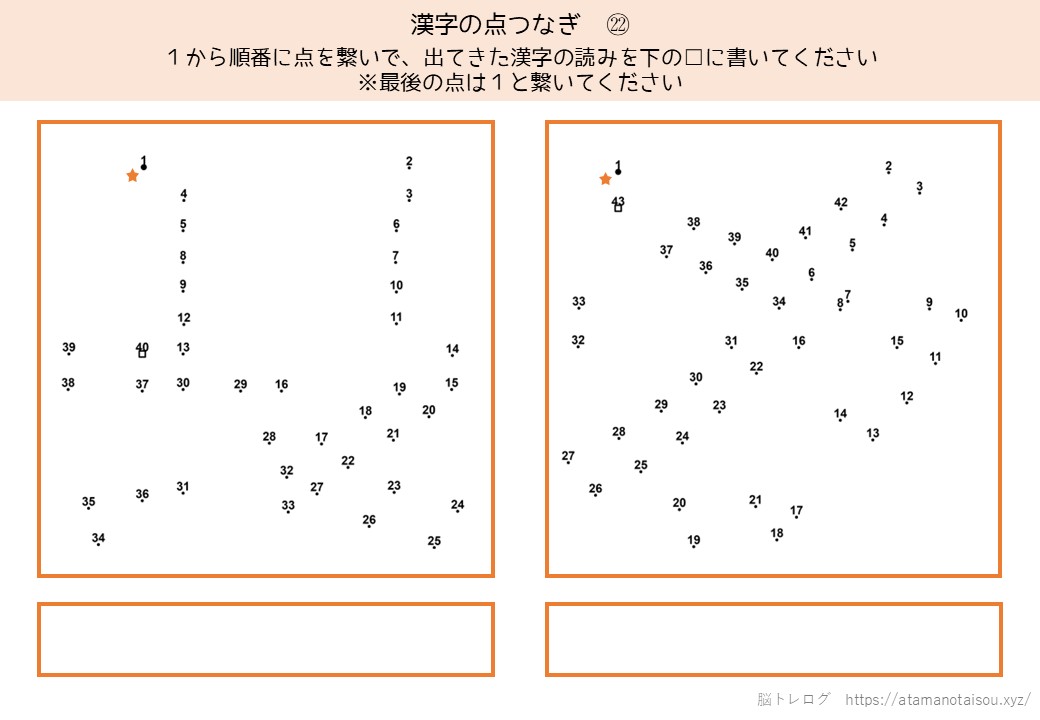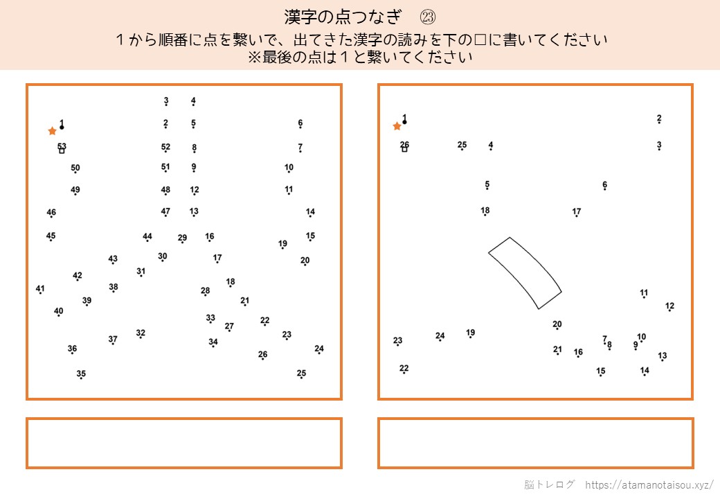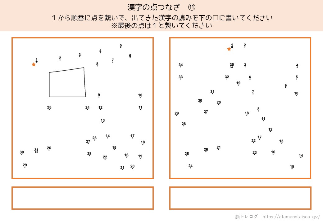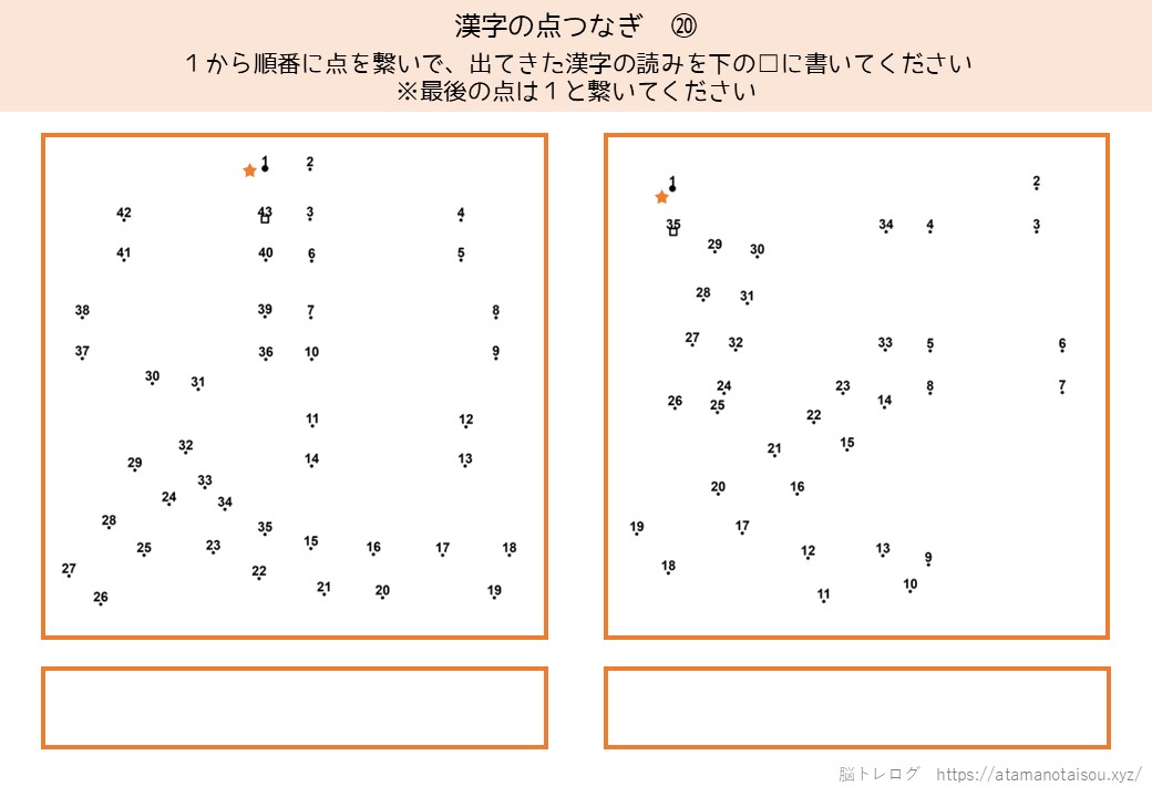 認知症予防やレクリエーションなどに使える高齢者向けの脳トレプリント「漢字の点つなぎ」を無料でダウンロードしていただけるページです。