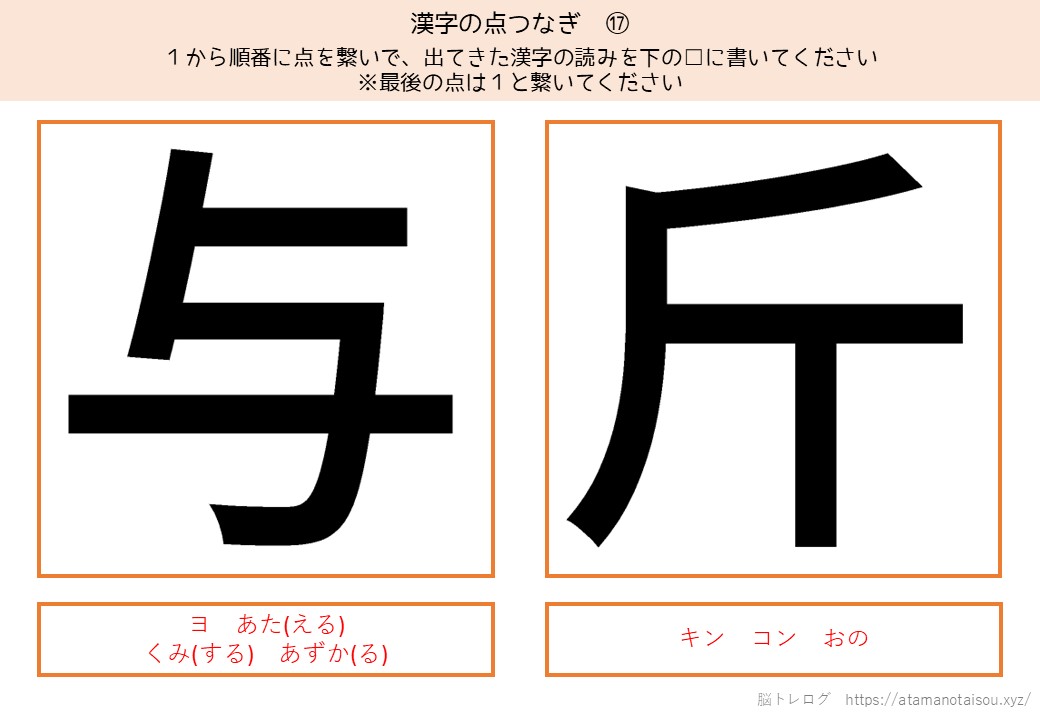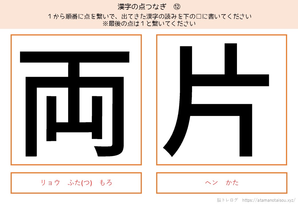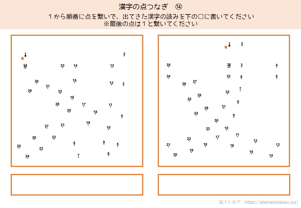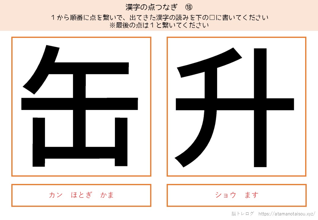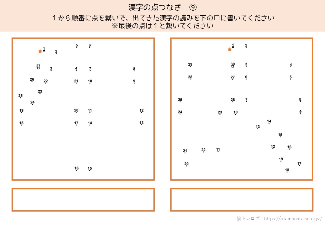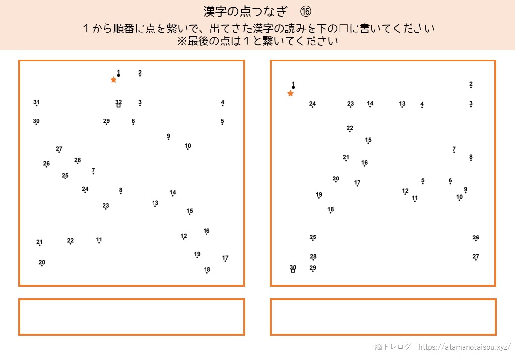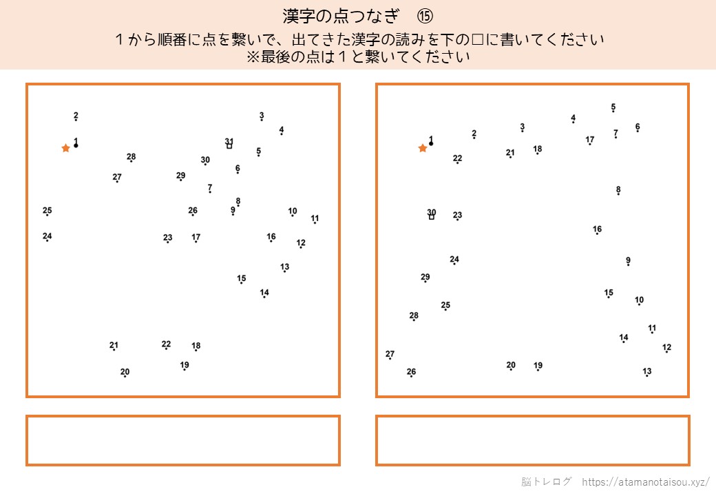 認知症予防やレクリエーションなどに使える高齢者向けの脳トレプリント「漢字の点つなぎ」を無料でダウンロードしていただけるページです。