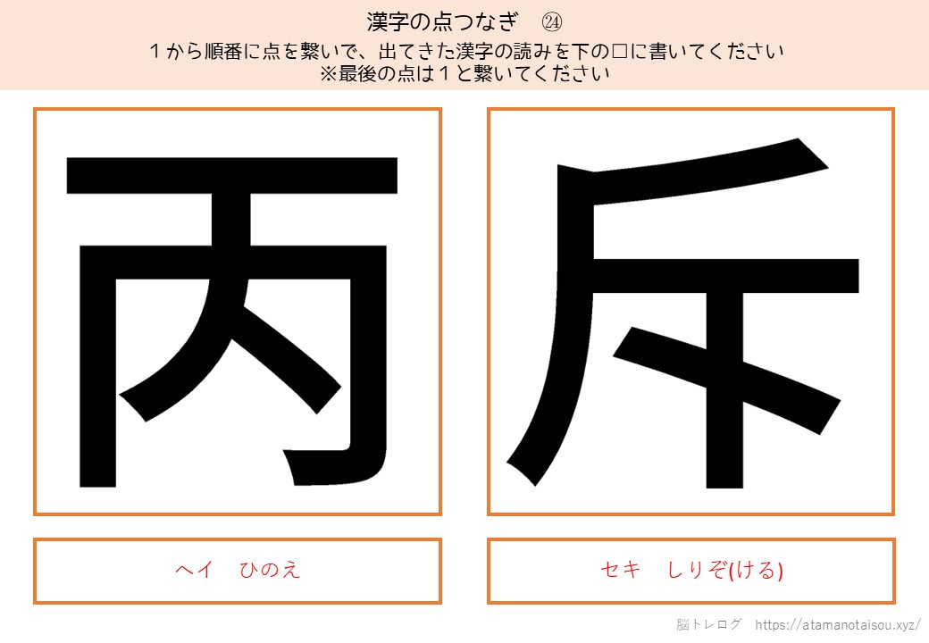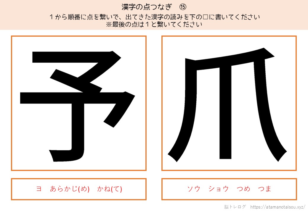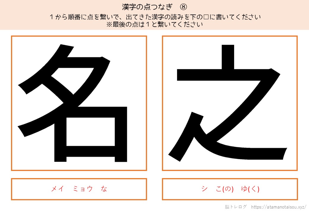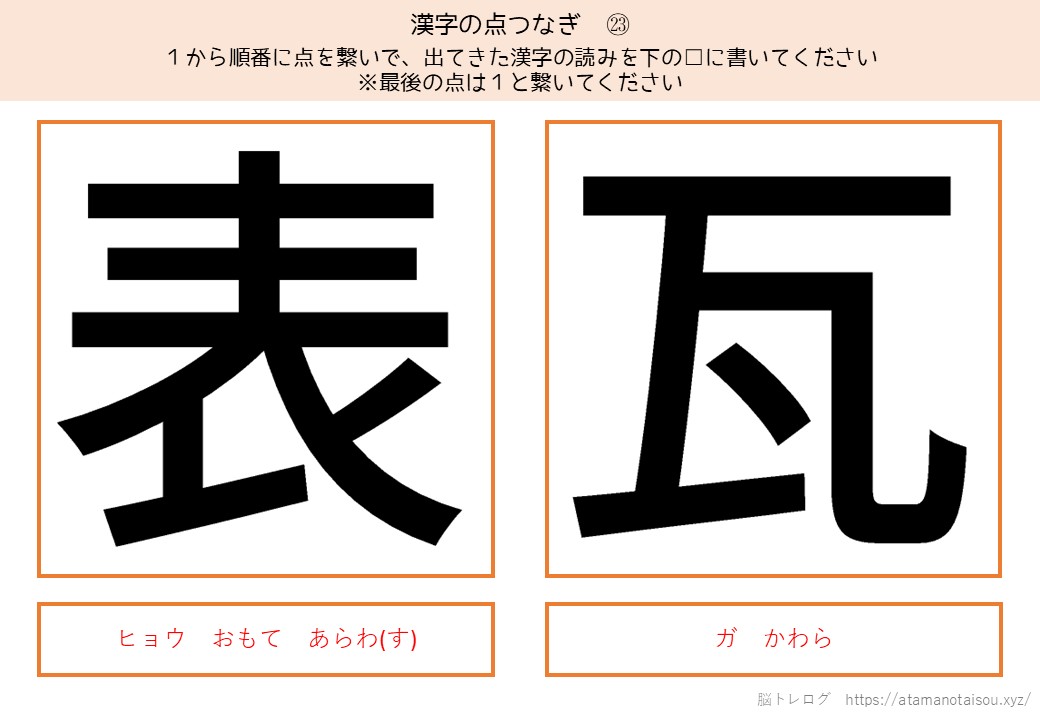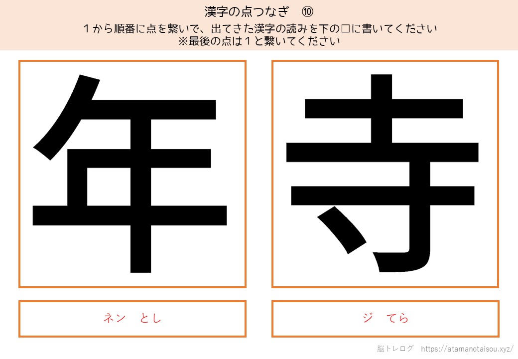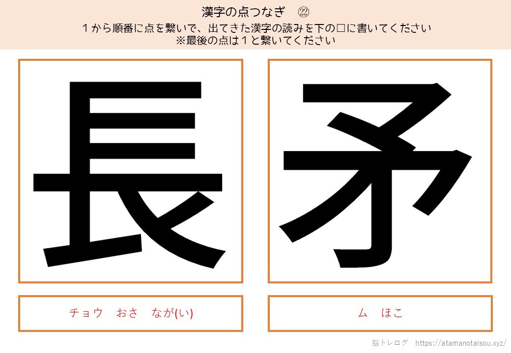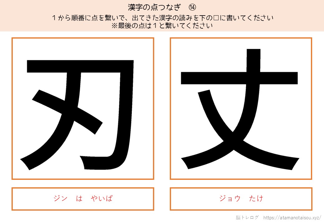 認知症予防やレクリエーションなどに使える高齢者向けの脳トレプリント「漢字の点つなぎ」を無料でダウンロードしていただけるページです。