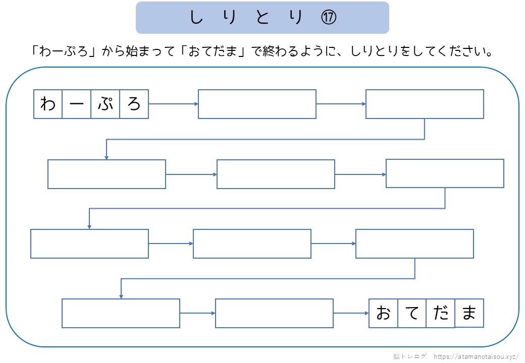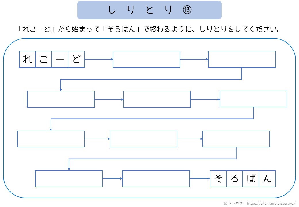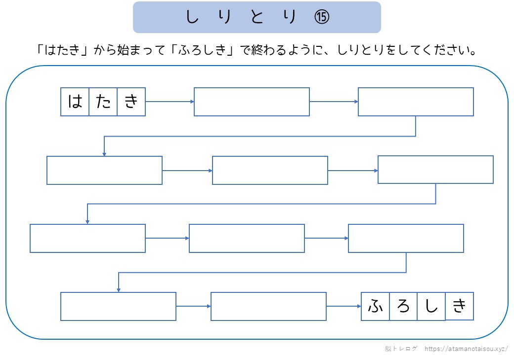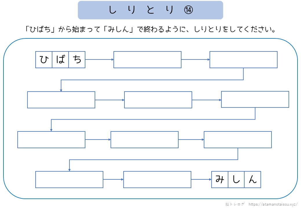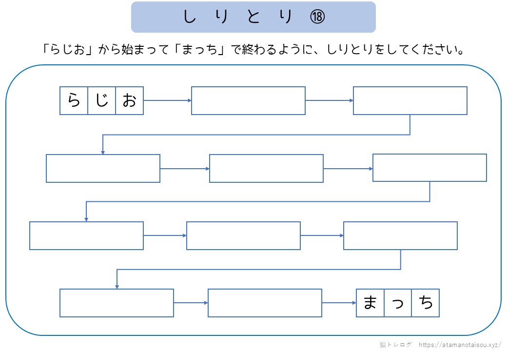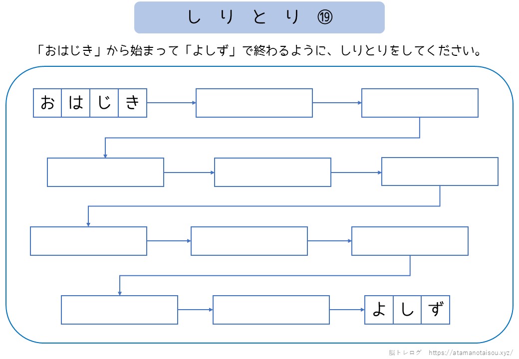 認知症予防などに使える高齢者向けの脳トレプリント「しりとり」を無料でダウンロードしていただけるページです。