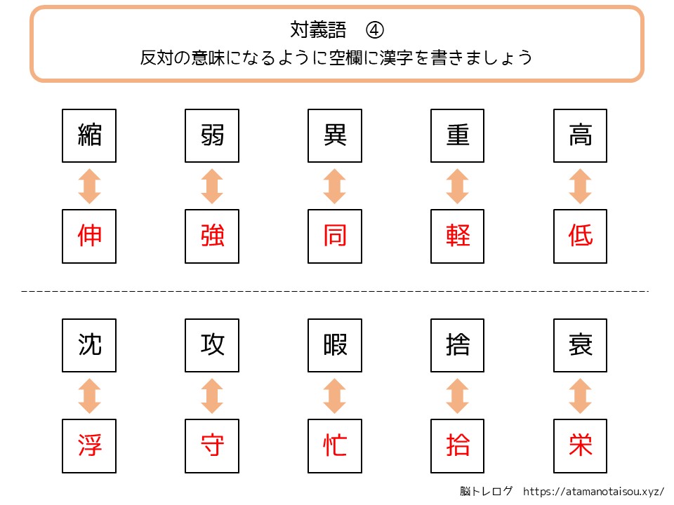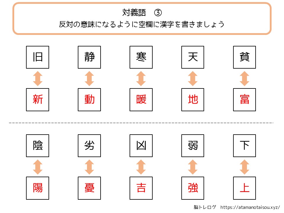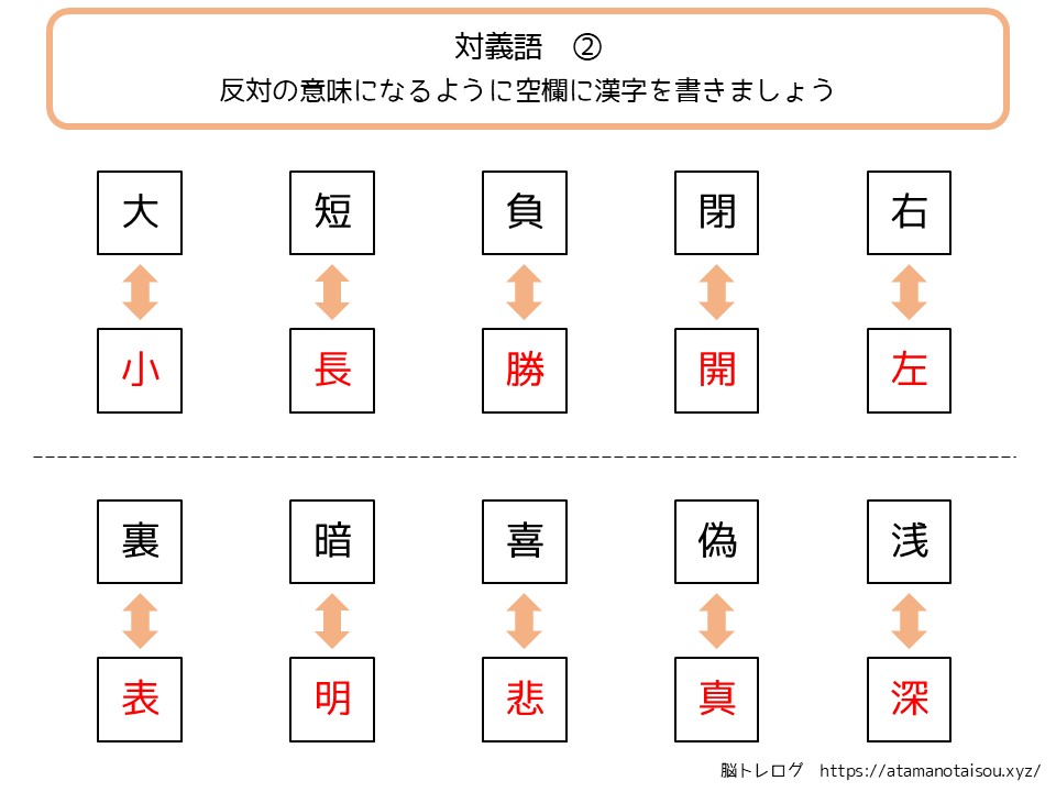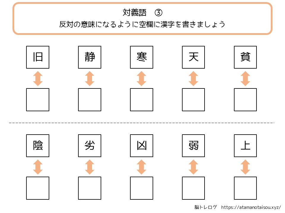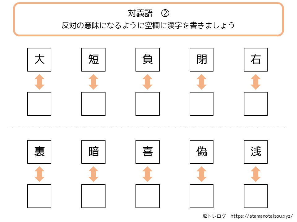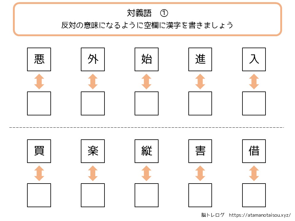 認知症予防やレクリエーションなどに使える高齢者向けの脳トレプリント「漢字の対義語」を無料でダウンロードしていただけるページです。
