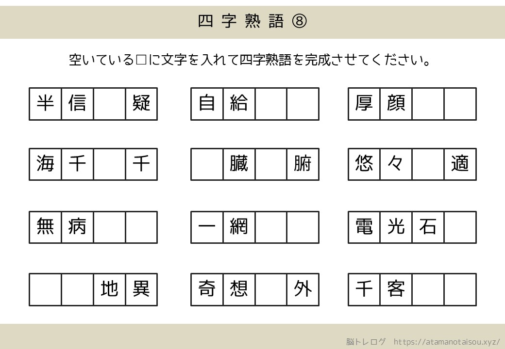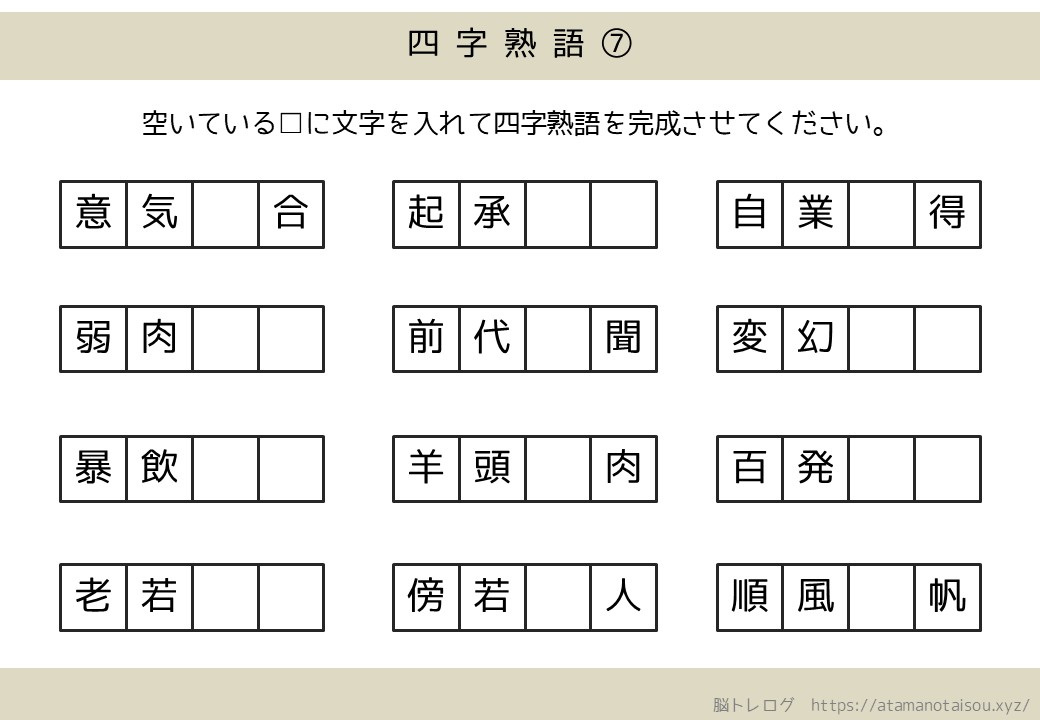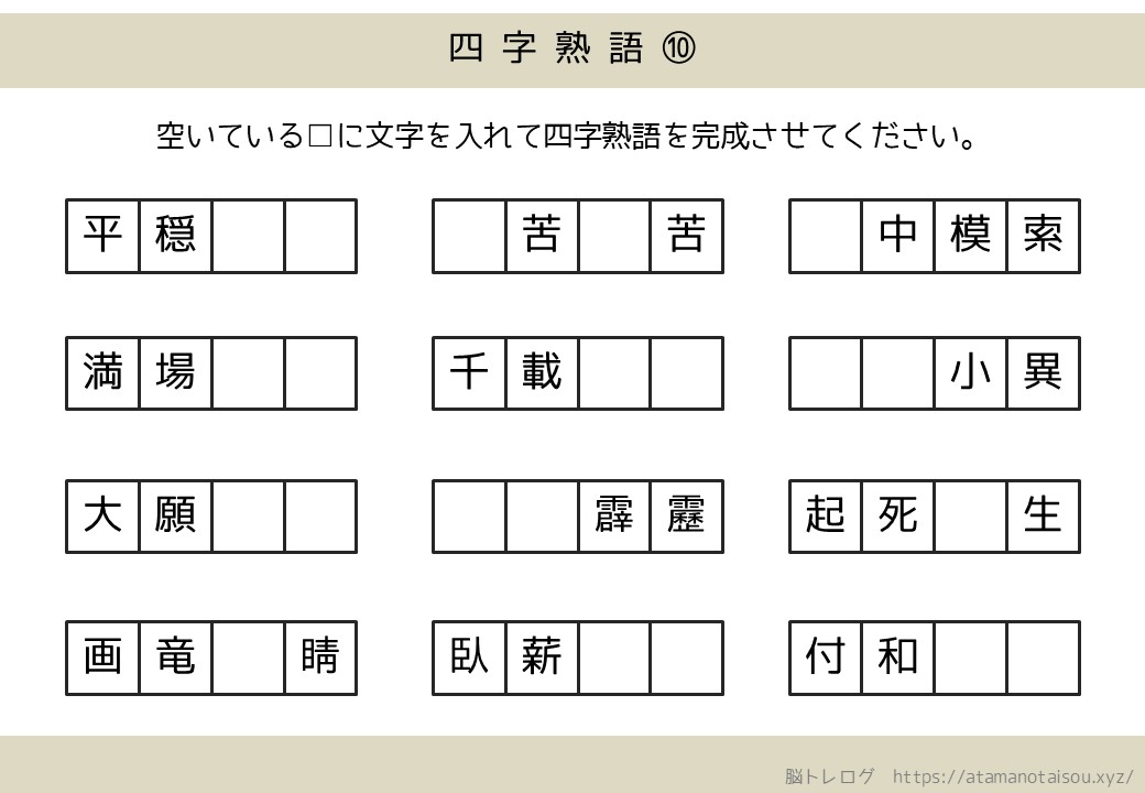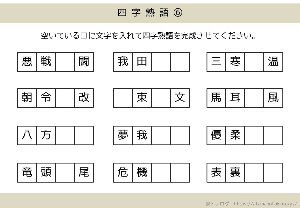認知症予防などに使える高齢者向けの脳トレプリント「四字熟語の穴埋め」を無料でダウンロードしていただけるページです。