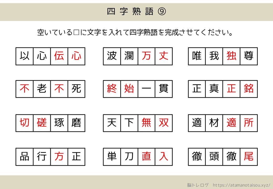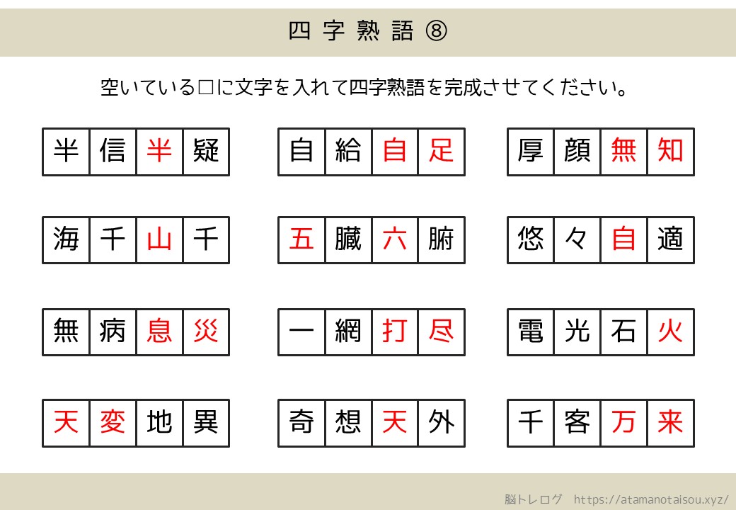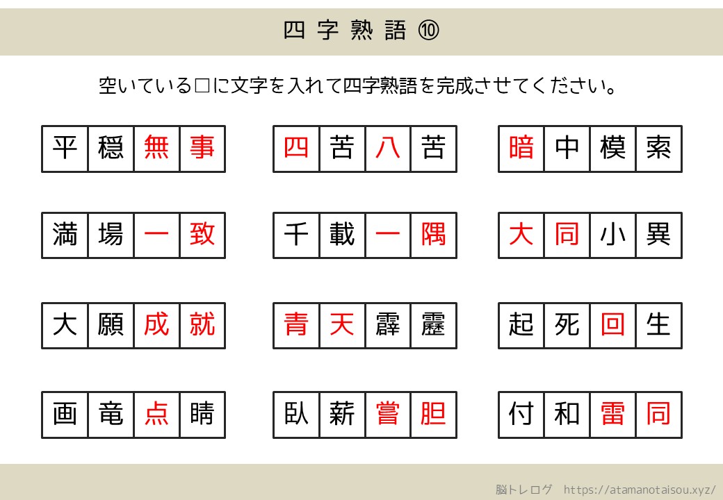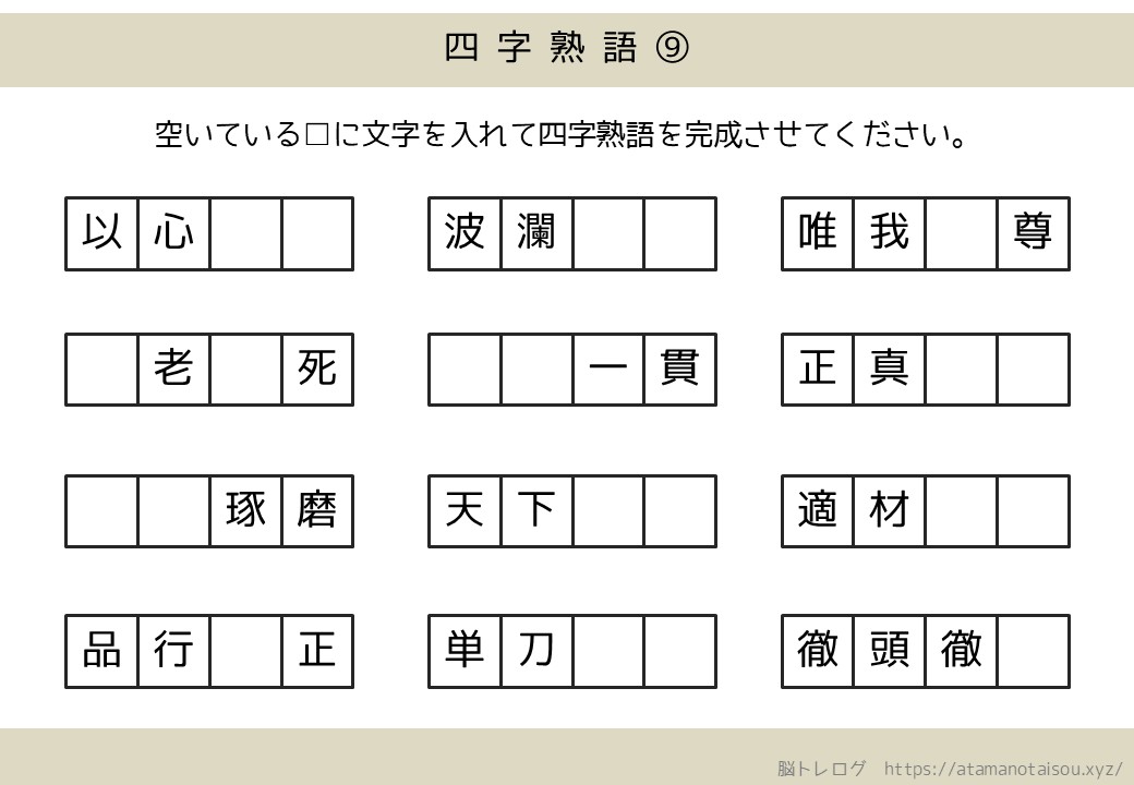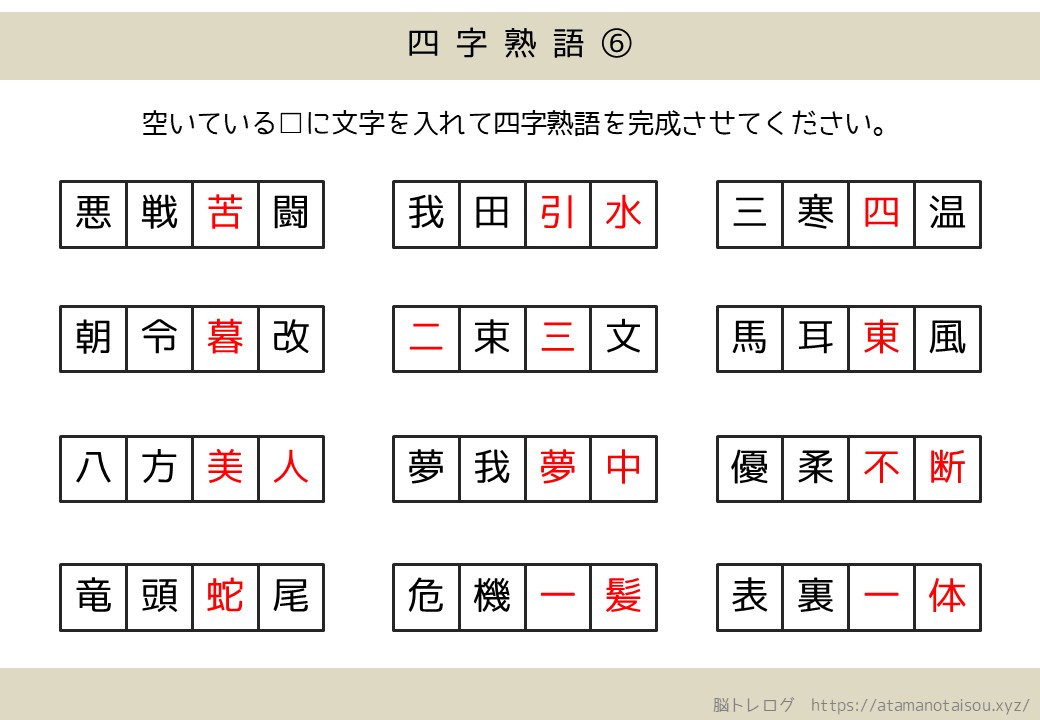 認知症予防などに使える高齢者向けの脳トレプリント「四字熟語の穴埋め」を無料でダウンロードしていただけるページです。